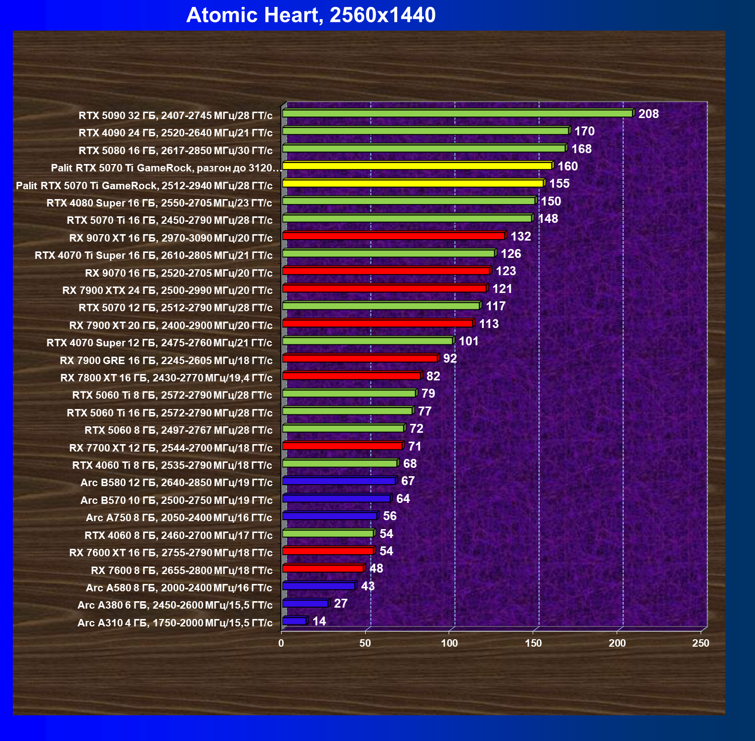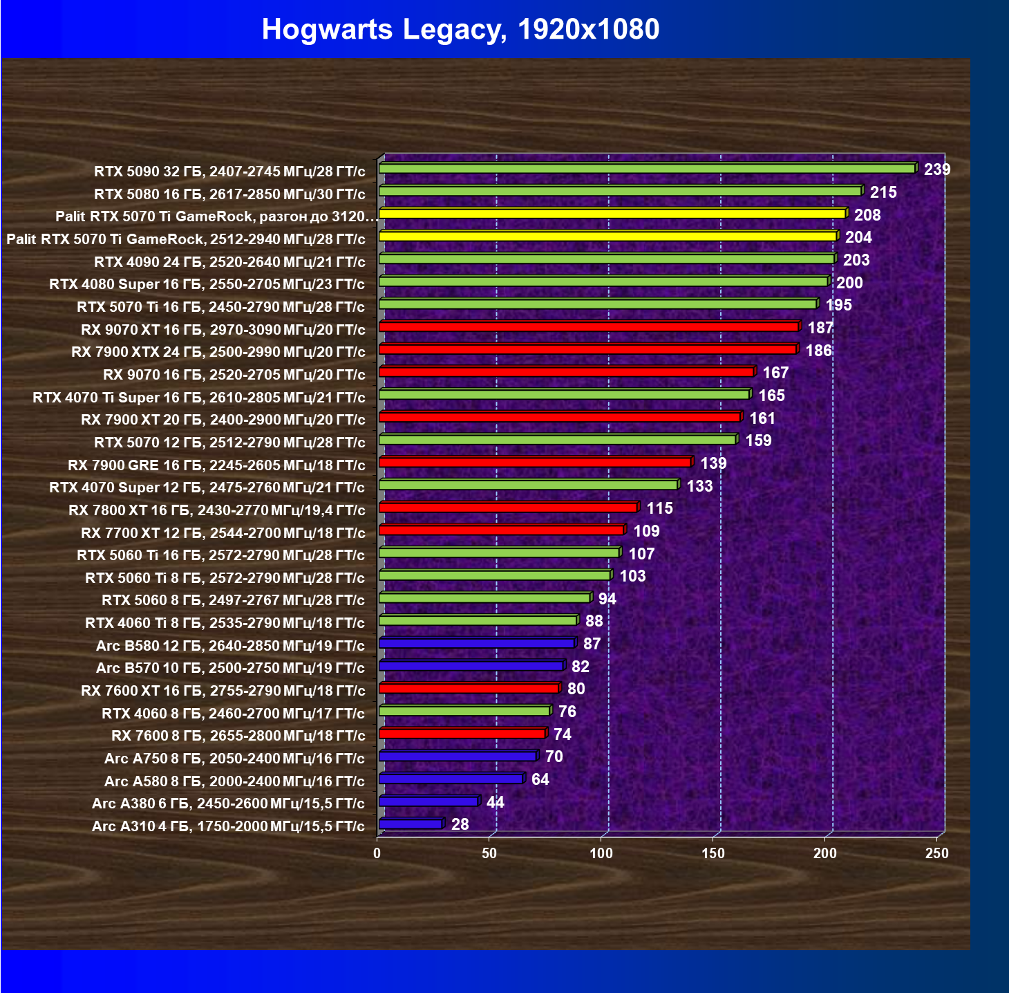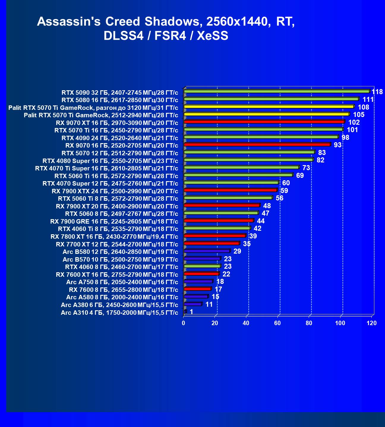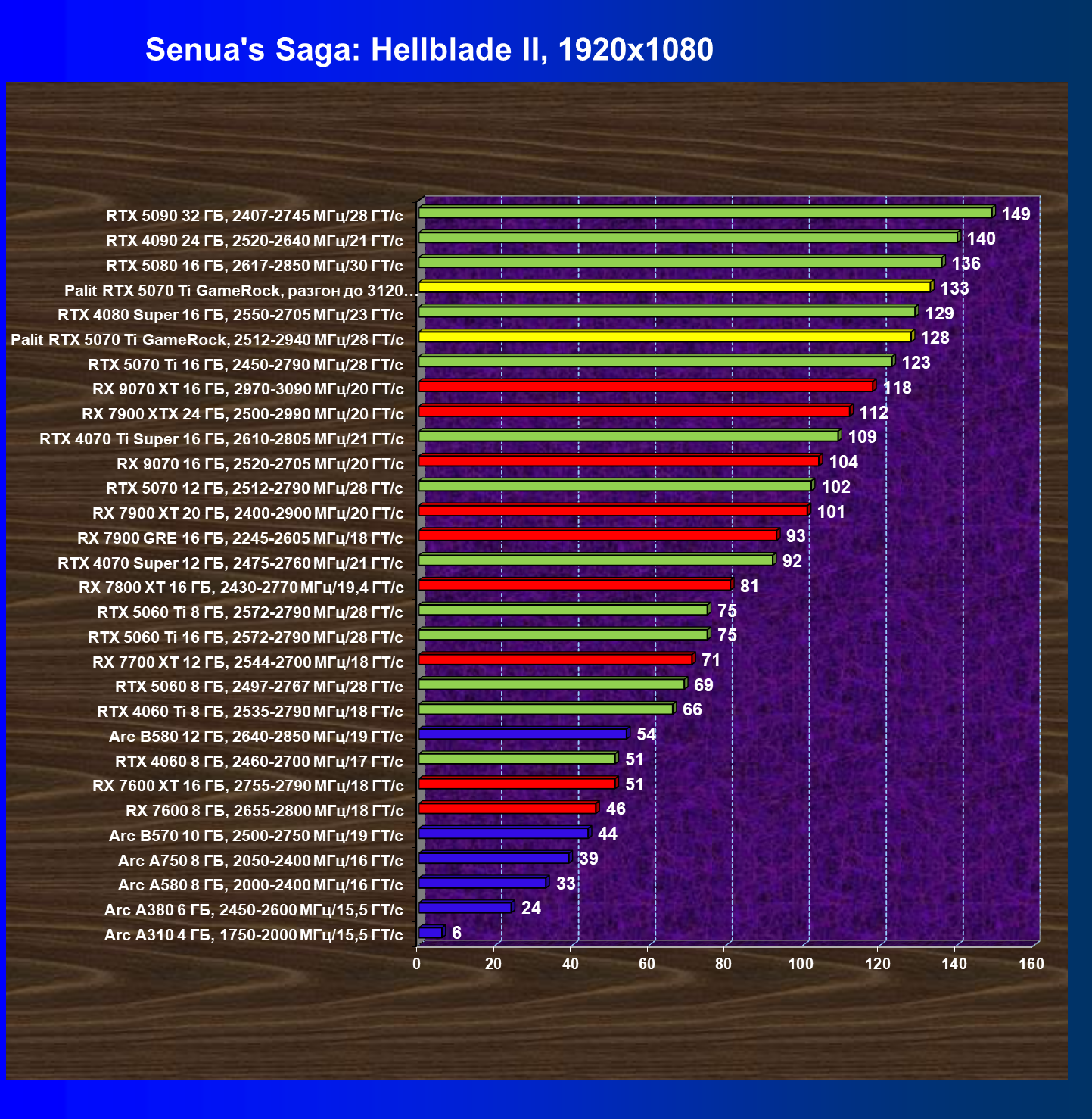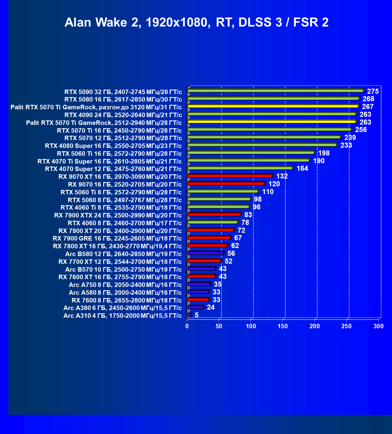 | 08 | RTX 5070 Ti 16 ГБ, 2450—2790 МГц/28 ГТ/с | 578 | 4967 | 86 000 |