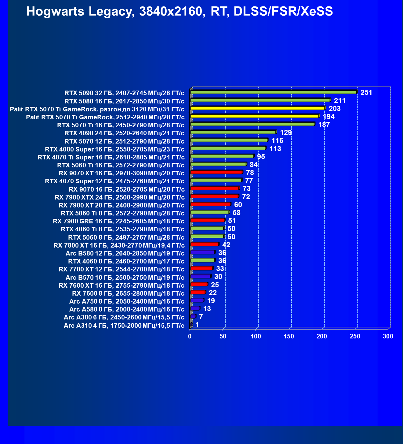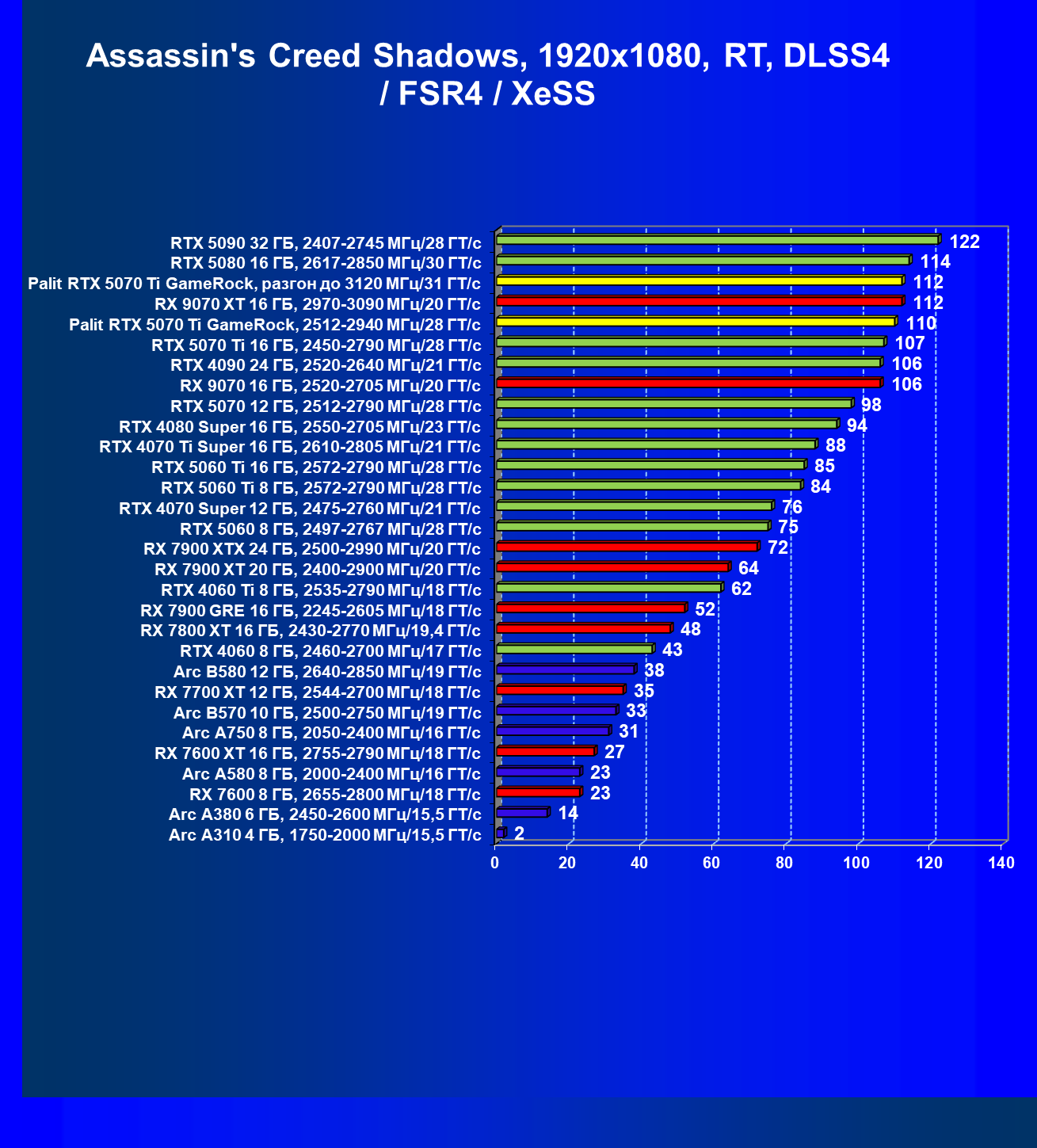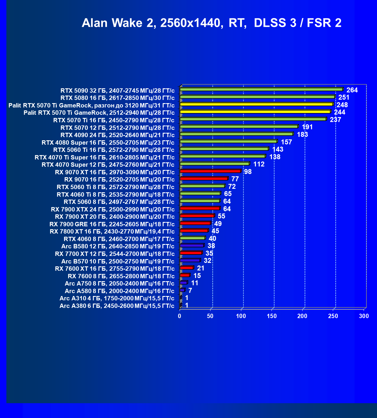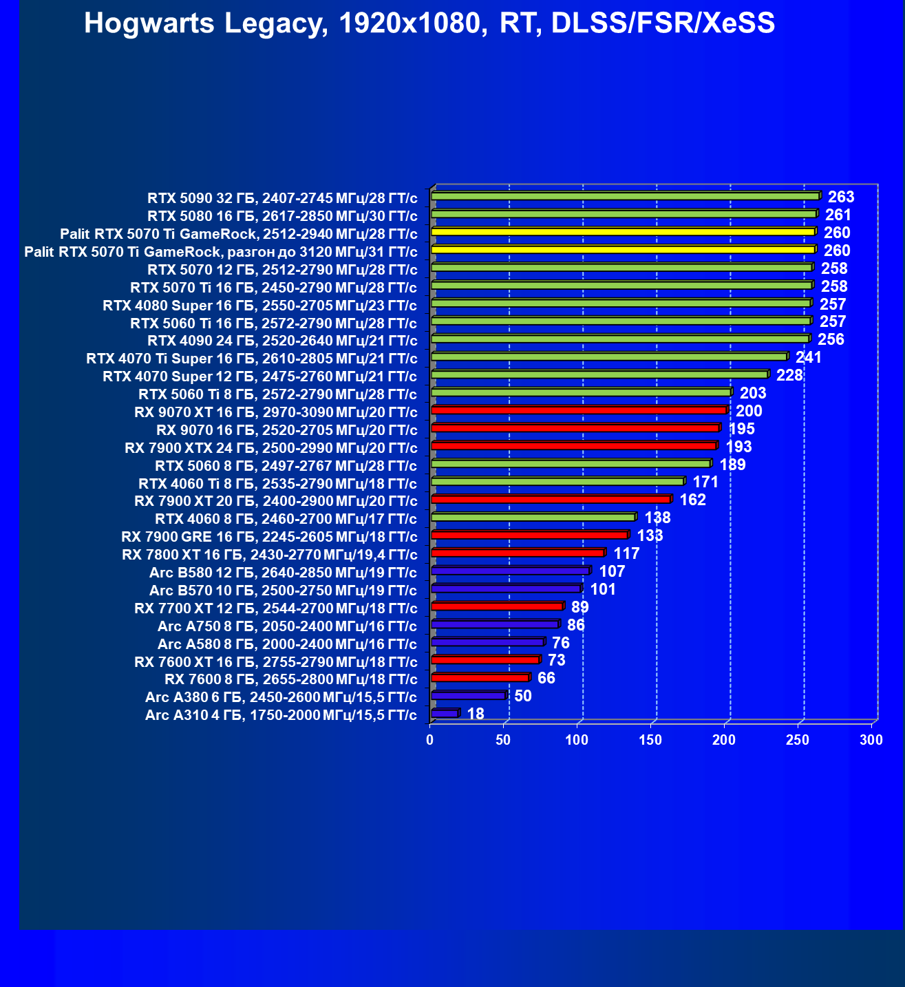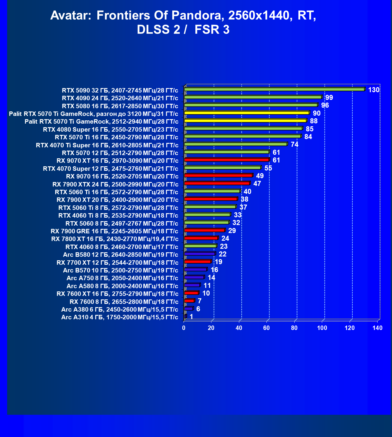 | 08 | RTX 5070 Ti 16 ГБ, 2450—2790 МГц/28 ГТ/с | 578 | 4967 | 86 000 |