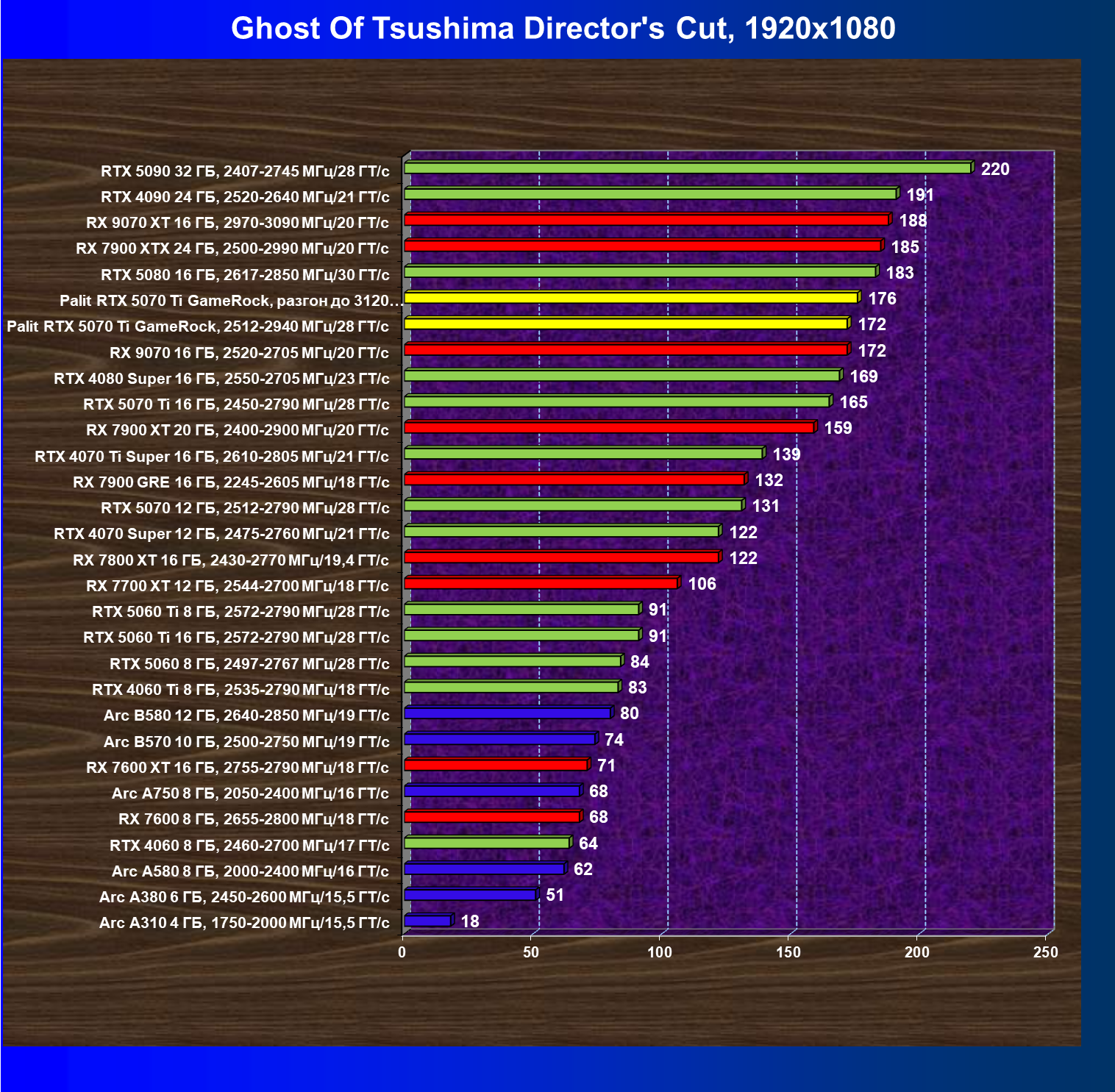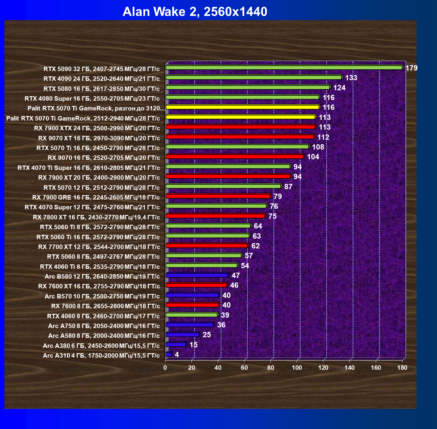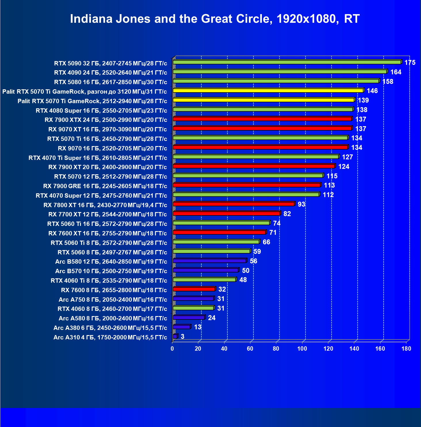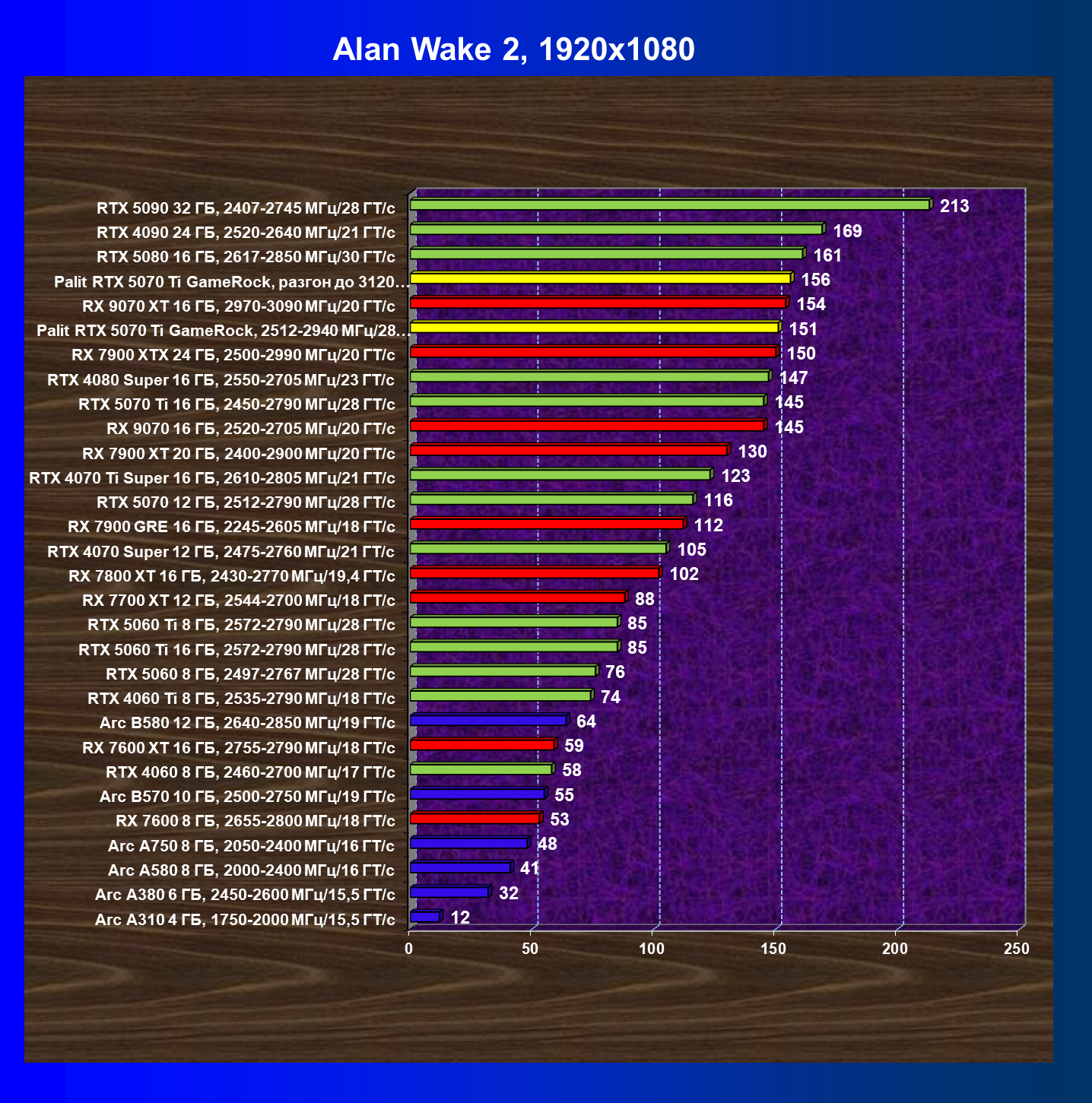 | 06 | Palit RTX 5070 Ti GameRock, 2512—2940 МГц/28 ГТ/с | 5175 | 602 | 86 000 |