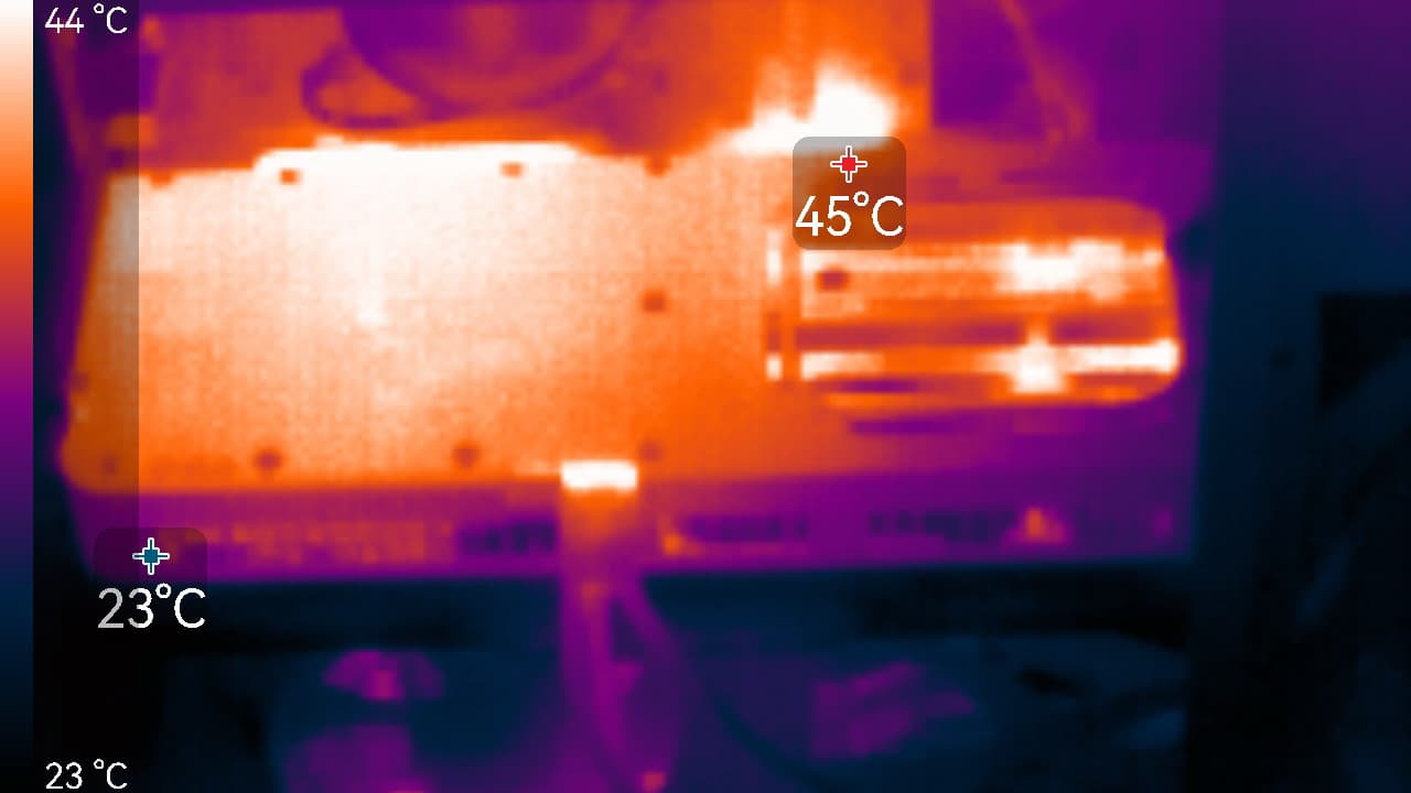 В режиме простоя в 2D температура была не выше 33 °C, вентиляторы не работали, уровень шума был равен фоновому — 18 дБА.