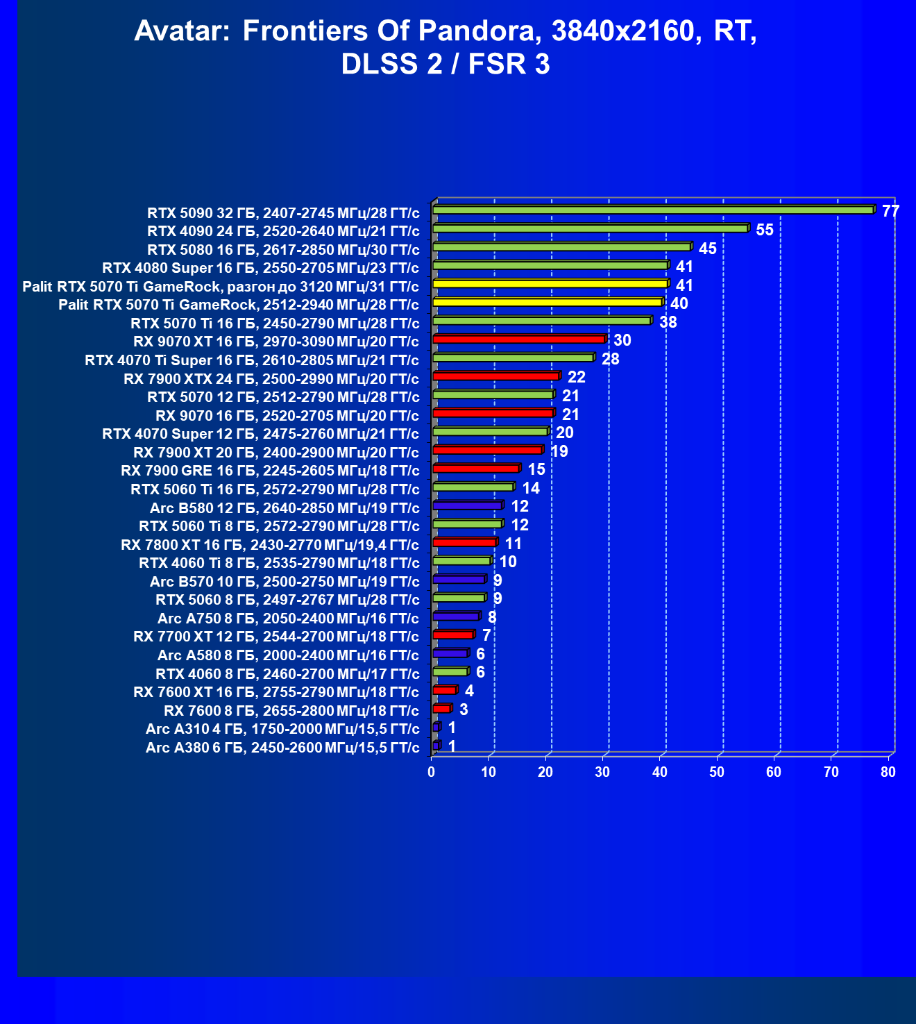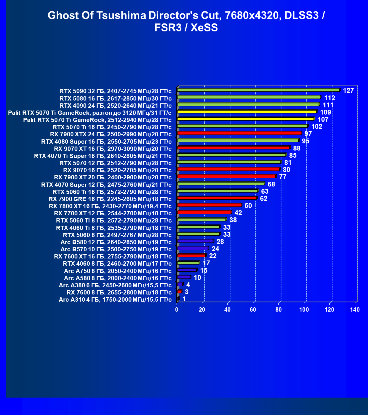 В таких играх GeForce RTX 5070 Ti занимает 5—7-е места в списке протестированных нами карт (после GeForce RTX 5090, 5080 и 4090, а также Radeon RX 9070 XT и 7900 XTX) и находится примерно на уровне GeForce RTX 4080 Super, опережая всех современных соперников из стана AMD. При этом мы уже не раз говорили, что подобные решения очень высокого уровня порой не могут раскрыть свой потенциал в классических играх даже в разрешении 4K — общая игровая производительность ограничивается системными ресурсами, в основном производительностью CPU. Поэтому вывод прост: можно играть на самых высоких настройках графики в любом разрешении, включая 4K (2160p), а в некоторых играх — даже в 8K.