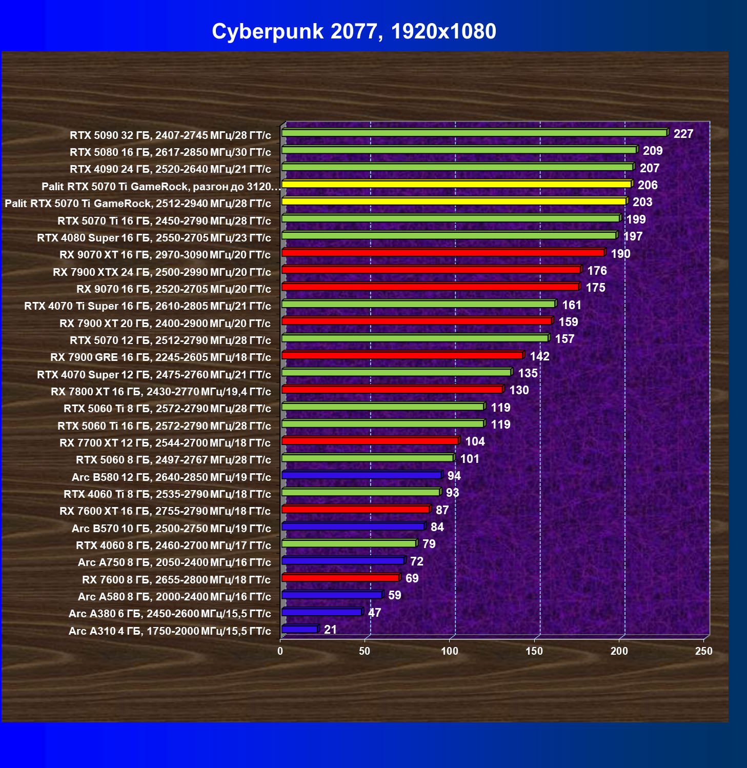 | 03 | Palit RTX 5070 Ti GameRock, разгон до 3120 МГц/31 ГТ/с | 12833 | 1492 | 86 000 |