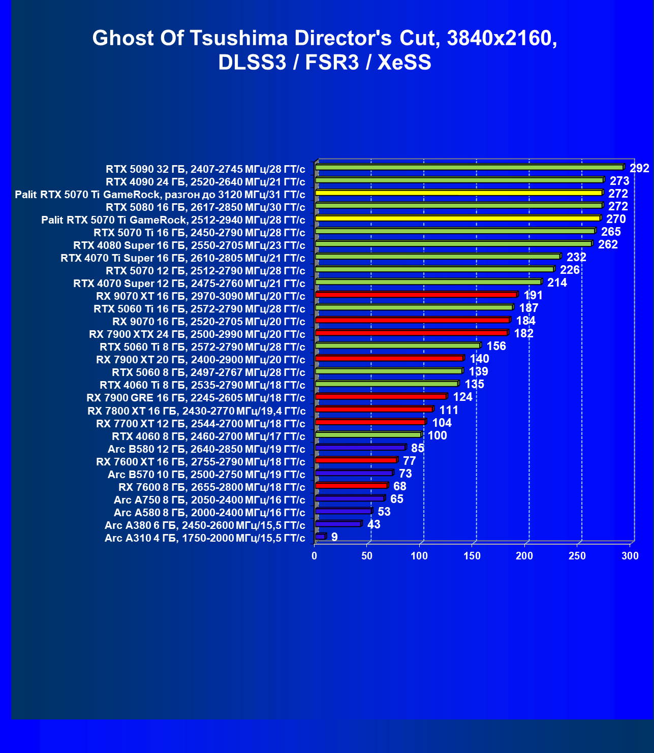 Здесь ситуация уже совсем иная: GeForce RTX 5070 Ti уверенно занял второе место в своей группе (логично уступив GeForce RTX 5080), а объясняется это тем, что в пяти из десяти тестовых игр уже имеется поддержка DLSS 4 с многокадровой генерацией (multiframe generation, MFG), что позволяет картам поколения GeForce RTX 50 сильно, иногда в разы опережать предшественников по производительности.