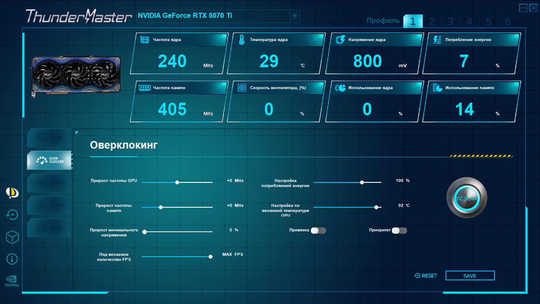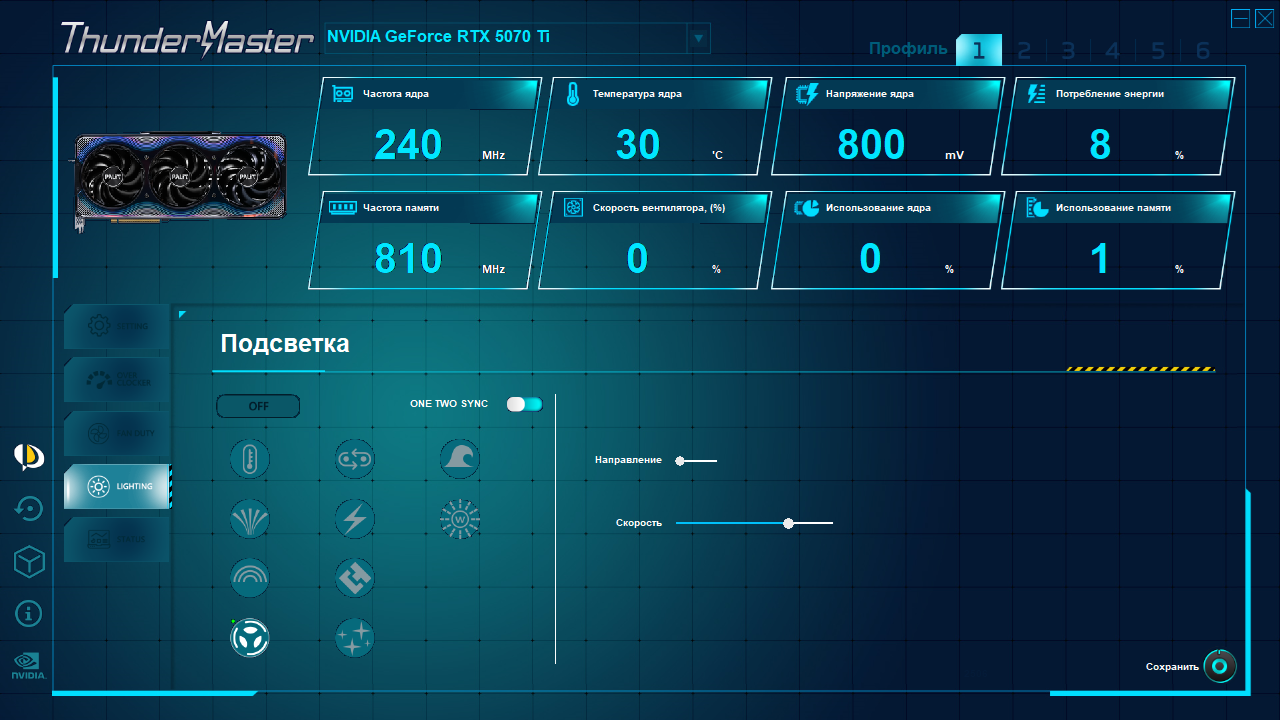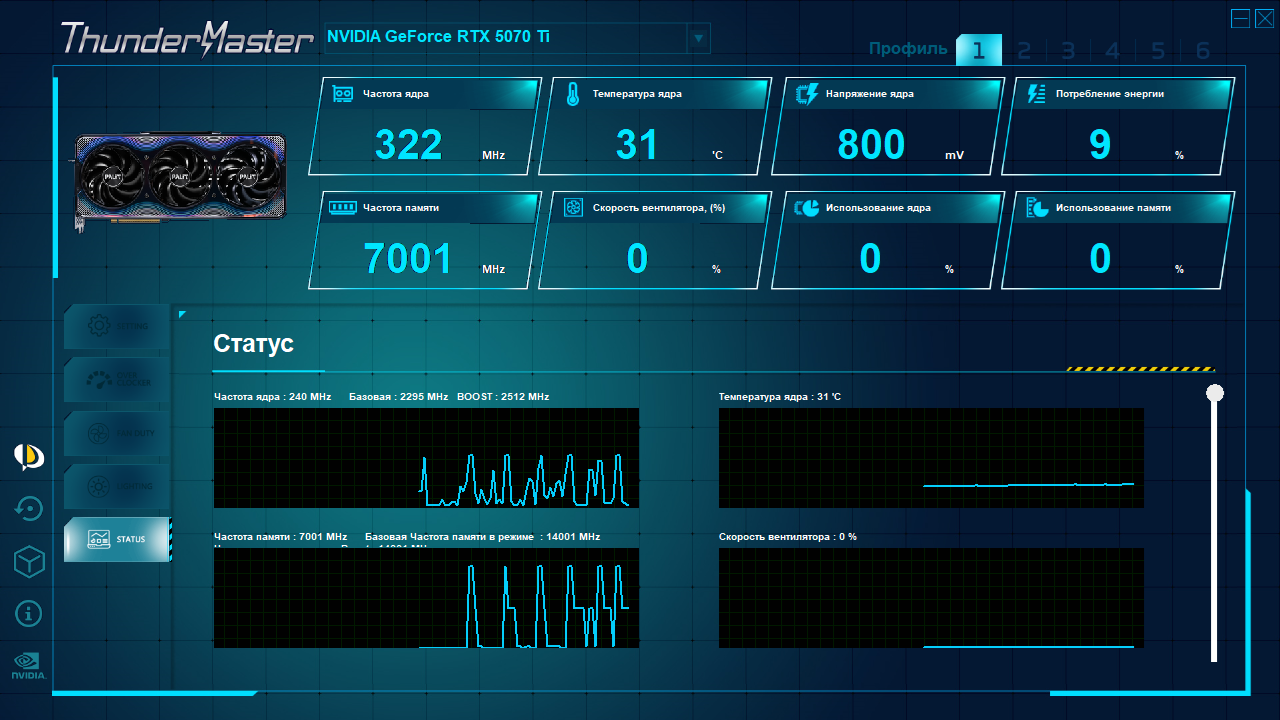 Управление работой карты обеспечивается с помощью фирменной утилиты ThunderMaster, мы о ней уже много раз писали: программа предоставляет управление вентиляторами (три вентилятора объединены в 2 блока: центральный и боковые), частотами работы карты и напряжением ядра и слежение за состоянием карты (мониторинг).