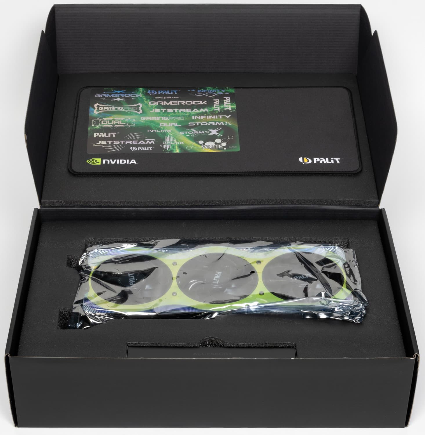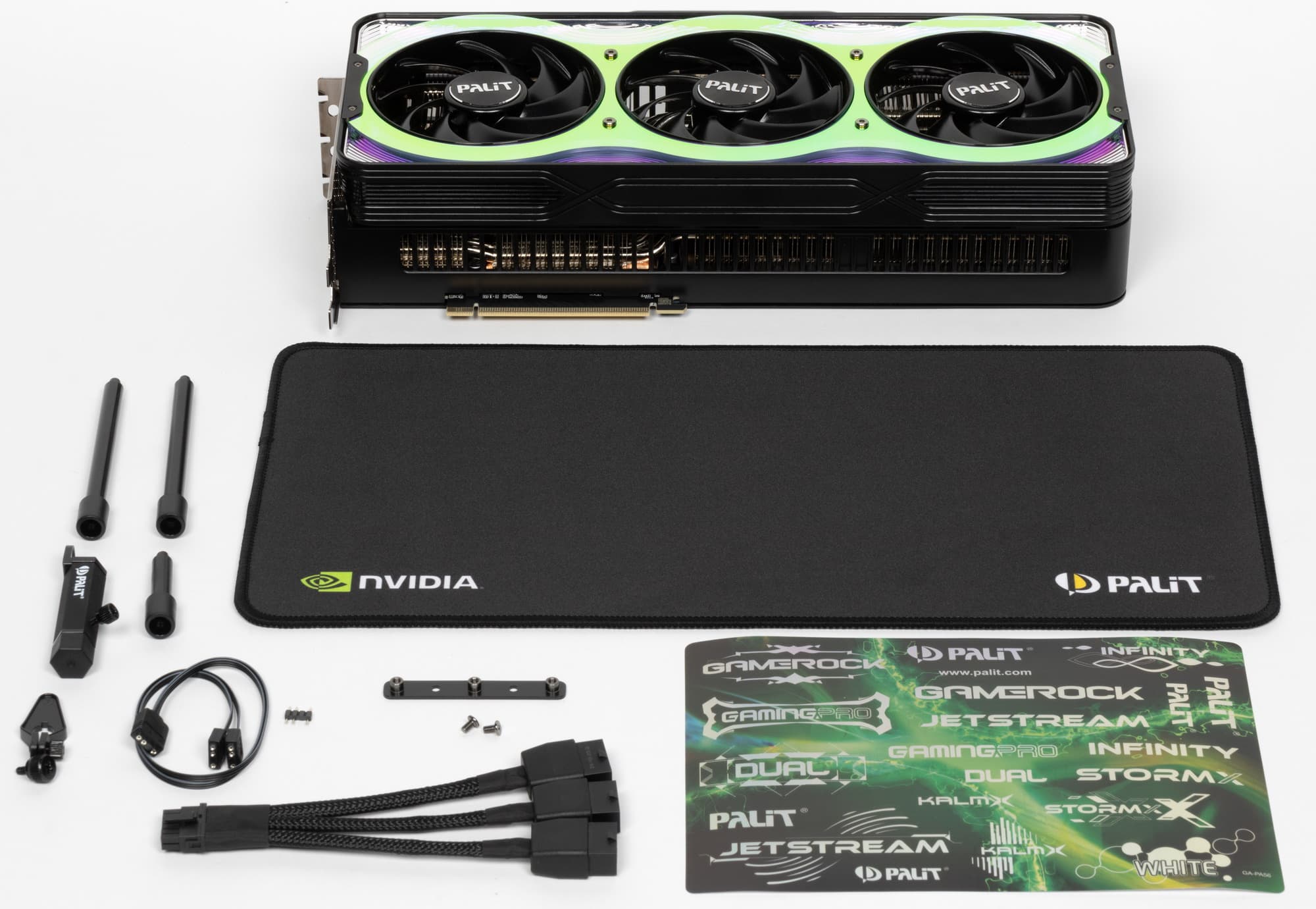 В комплекте поставки кроме карты и адаптера питания имеется еще разборная подставка под видеокарту с регулируемым по высоте упором, а также кабель синхронизации подсветки, бонусные наклейки и коврик для мыши.