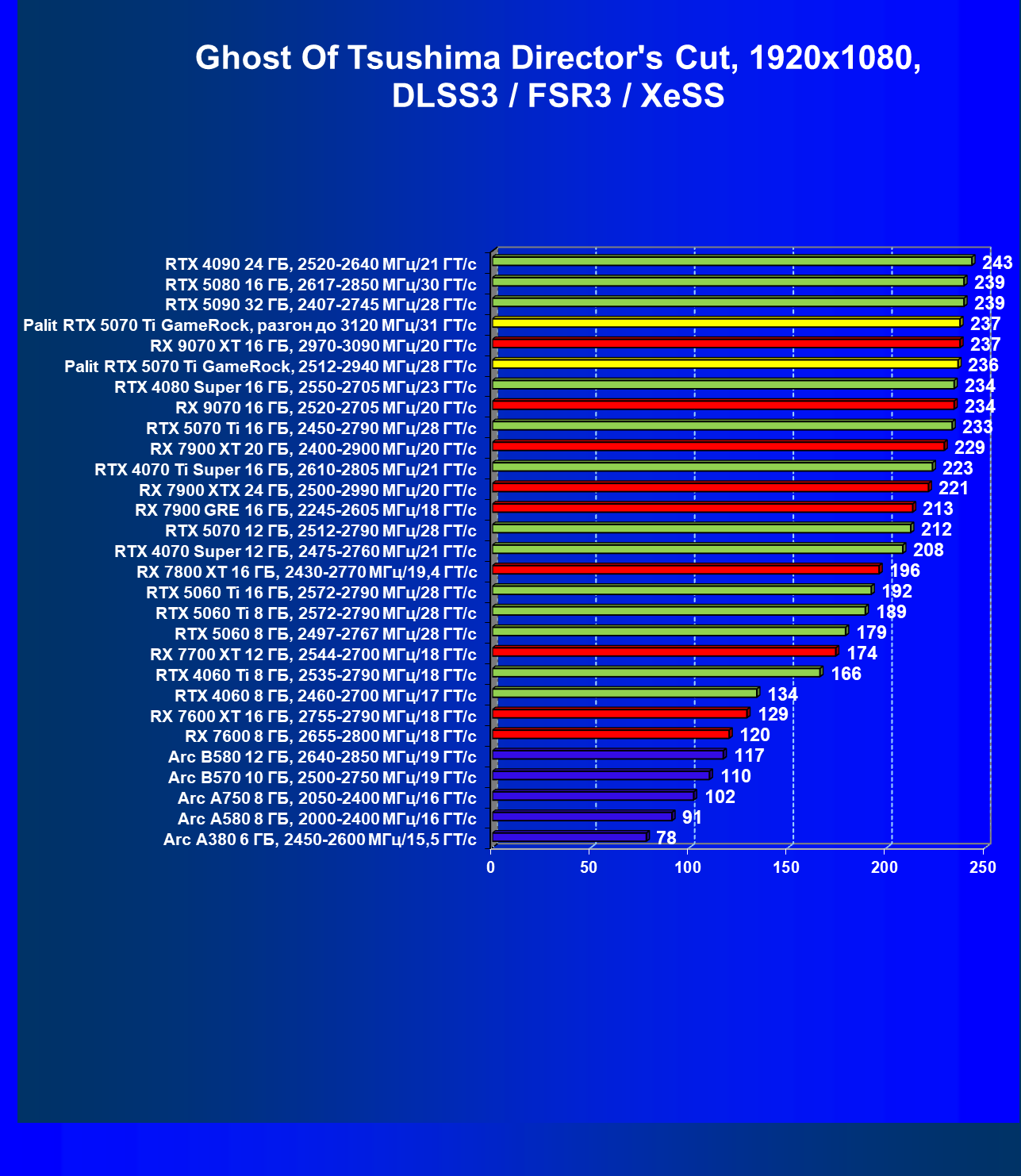 Отметим еще раз, что GeForce RTX 5070 Ti будет обеспечивать отличный комфорт во всех играх на высоких настройках качества при отключенных трассировке лучей и технологиях масштабирования в разрешениях до 2160p (4K) включительно. При использовании RT (без апскейлинга) также можно получить хороший комфорт в разрешениях до 4K, но мы все-таки советуем включать DLSS, особенно MFG, и тогда карта обойдет всех конкурентов прошлого поколения и даст еще более приятный комфорт в игре.
