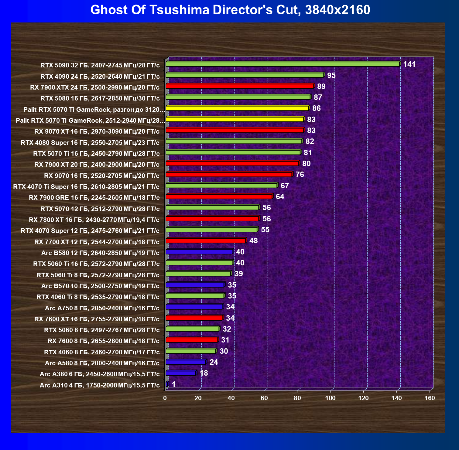 В среднем в разрешении 4K GeForce RTX 5070 Ti очень существенно опережает своего прямого предшественника RTX 4070 Ti Super, а также конкурента Radeon RX 7900 XT, немного отставая от RTX 4080 Super и RX 9070 XT. Повышенные частоты карты Palit позволили ей почти догнать GeForce RTX 4080 Super и даже обойти RX 9070 XT. Подчеркну, что в данном рейтинге учитываются только результаты в играх без включения RT.
