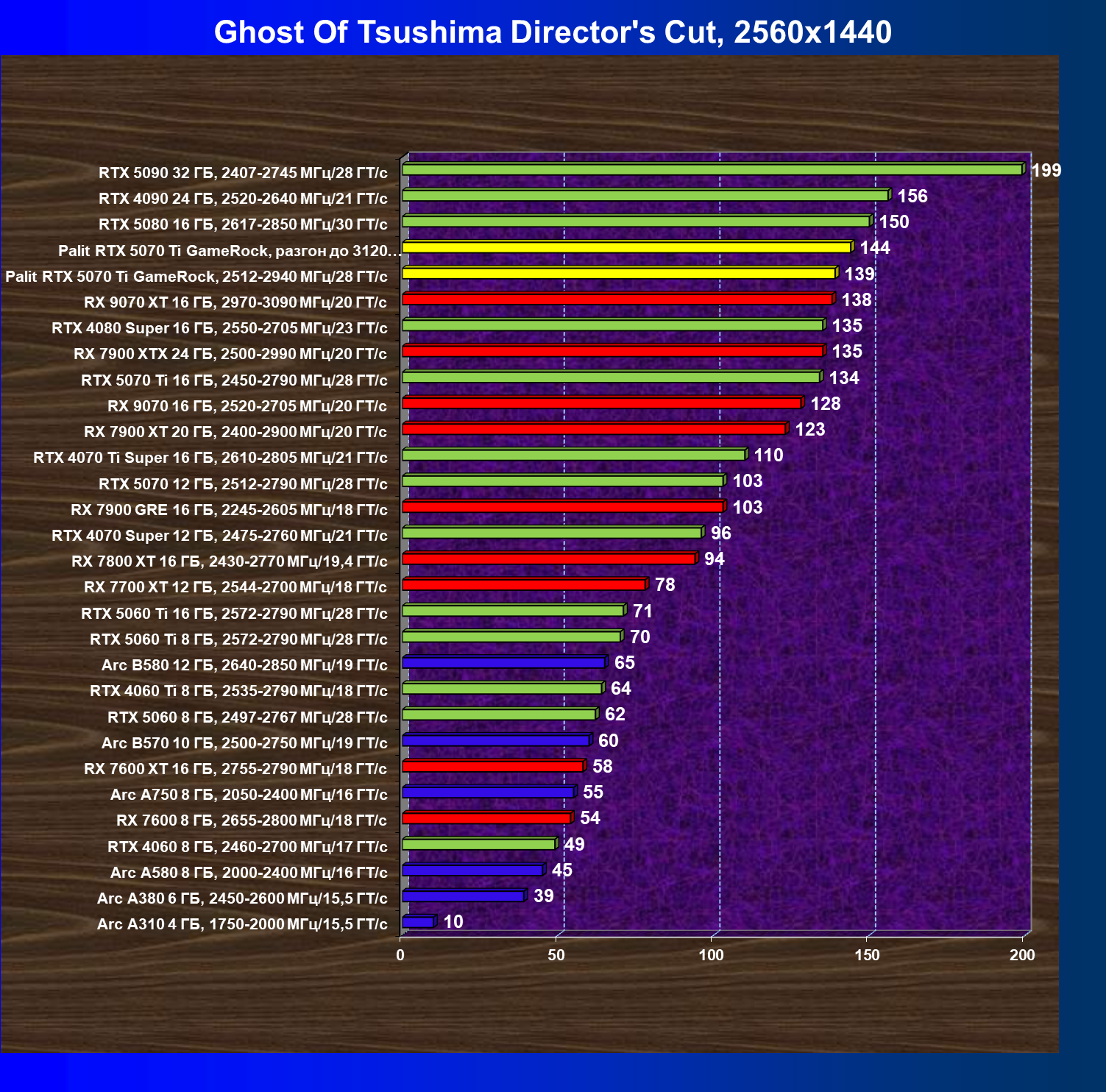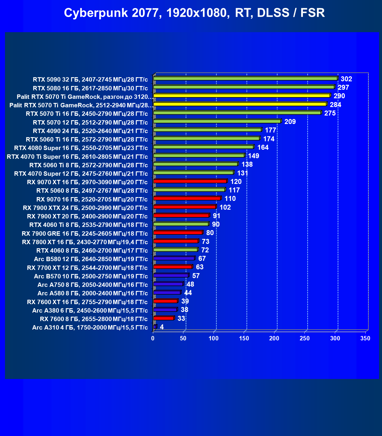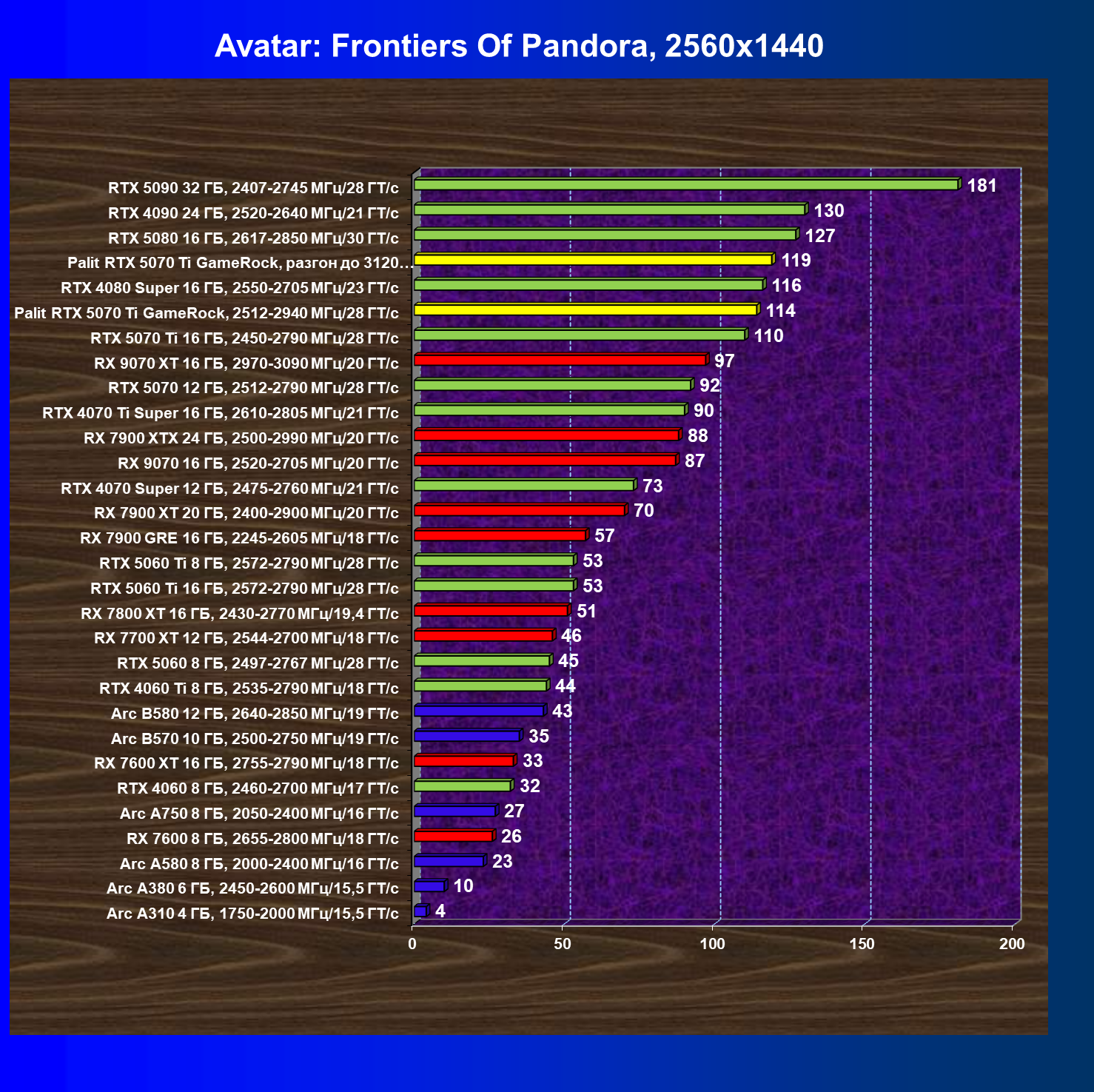 | 04 | Palit RTX 5070 Ti GameRock, разгон до 3120 МГц/31 ГТ/с | 5316 | 618 | 86 000 |