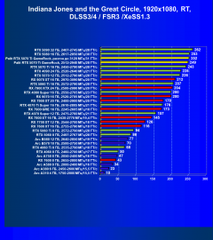 - Результаты тестов со включенной аппаратной трассировкой лучей и/или DLSS/FSR/XeSS в разрешениях 1920×1080, 2560×1440 и 3840×2160