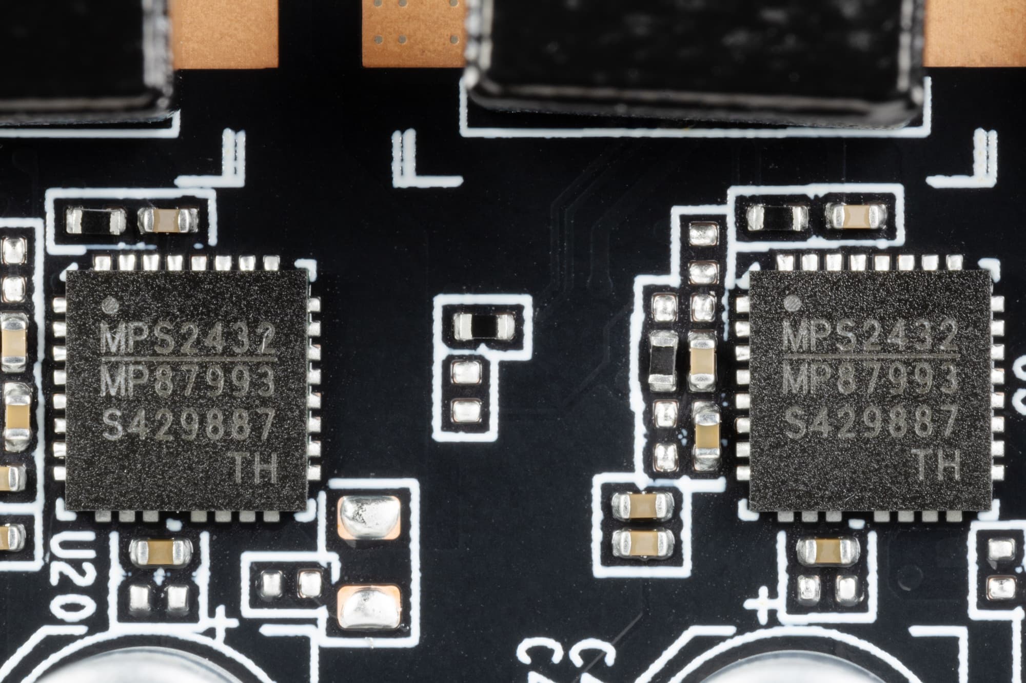 В преобразователе питания ядра и микросхем памяти используются транзисторные сборки DrMOS — MP87993 той же компании MPS, рассчитанные на 50 А.