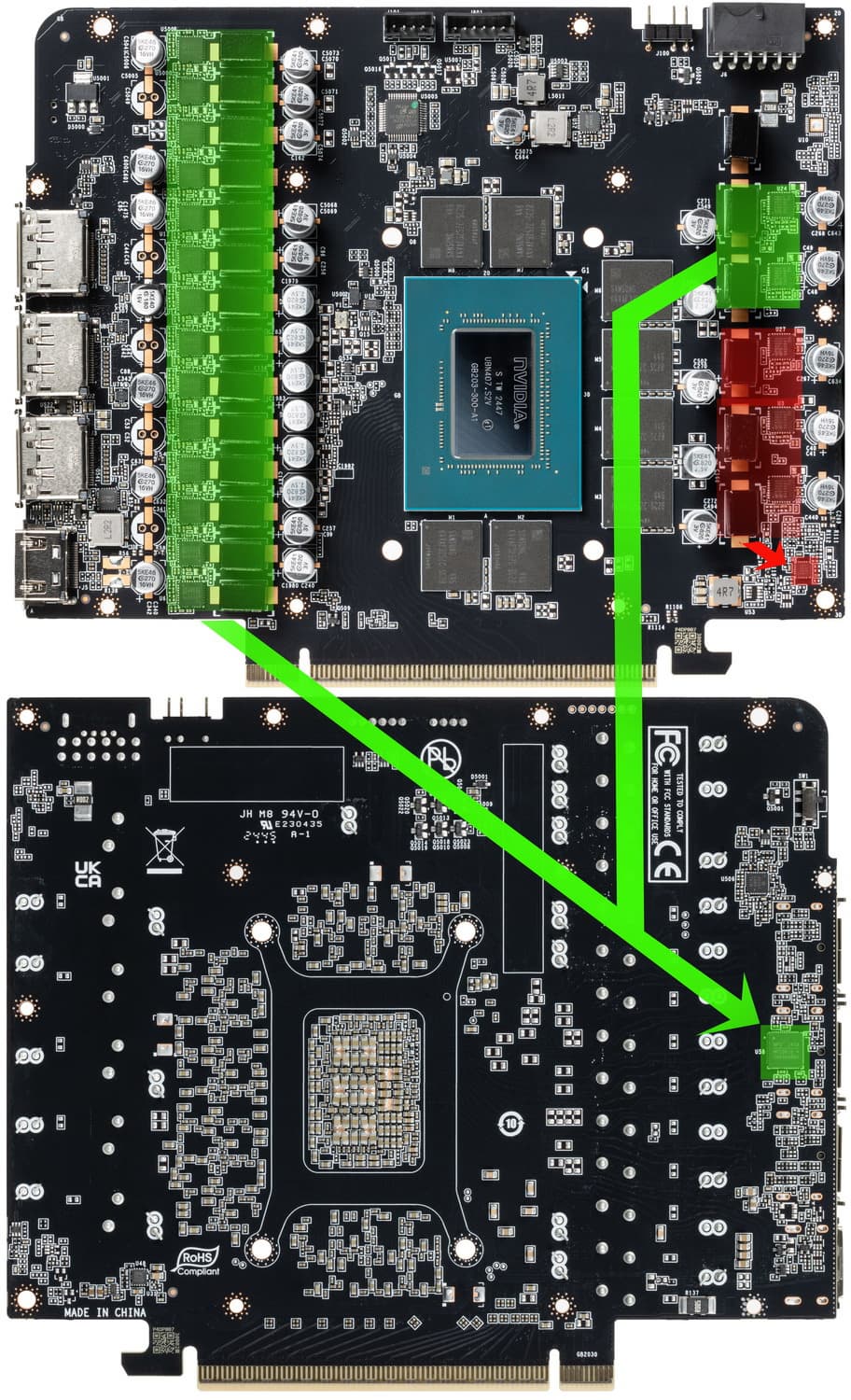 Зеленым цветом отмечена схема питания ядра, красным — памяти.