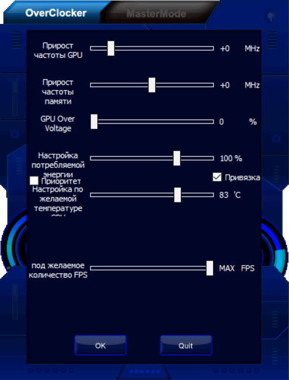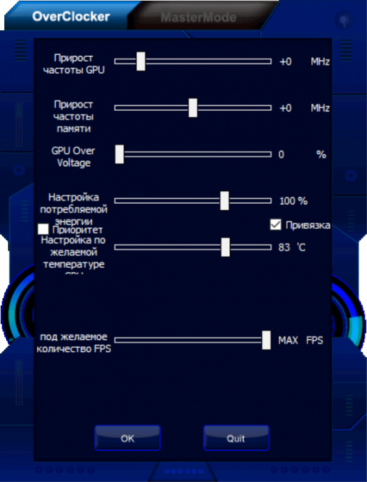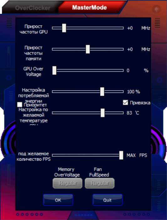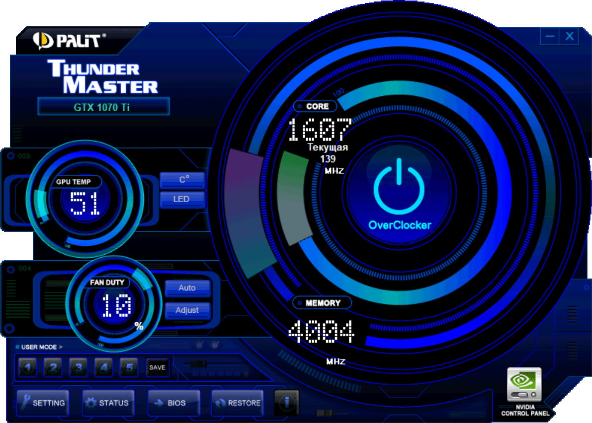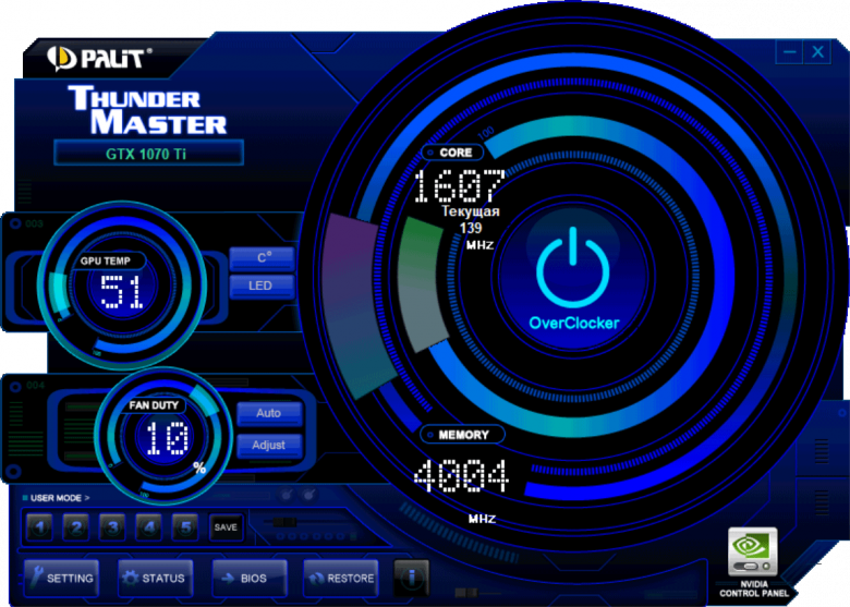 Регулирование частот и напряжений можно выполнять с помощью фирменной утилиты Palit Thunder Master, которая поставляется с картой на диске, а также ее можно скачать с сайта производителя. Последняя версия утилиты может автоматически настроить работу ускорителя на максимально возможные частоты (если владелец, например, не желает самостоятельно искать достижимый максимум). Также данная утилита нужна для автоматической активации режима разгона (OC Mode).