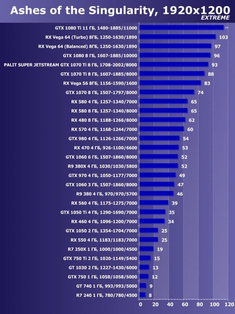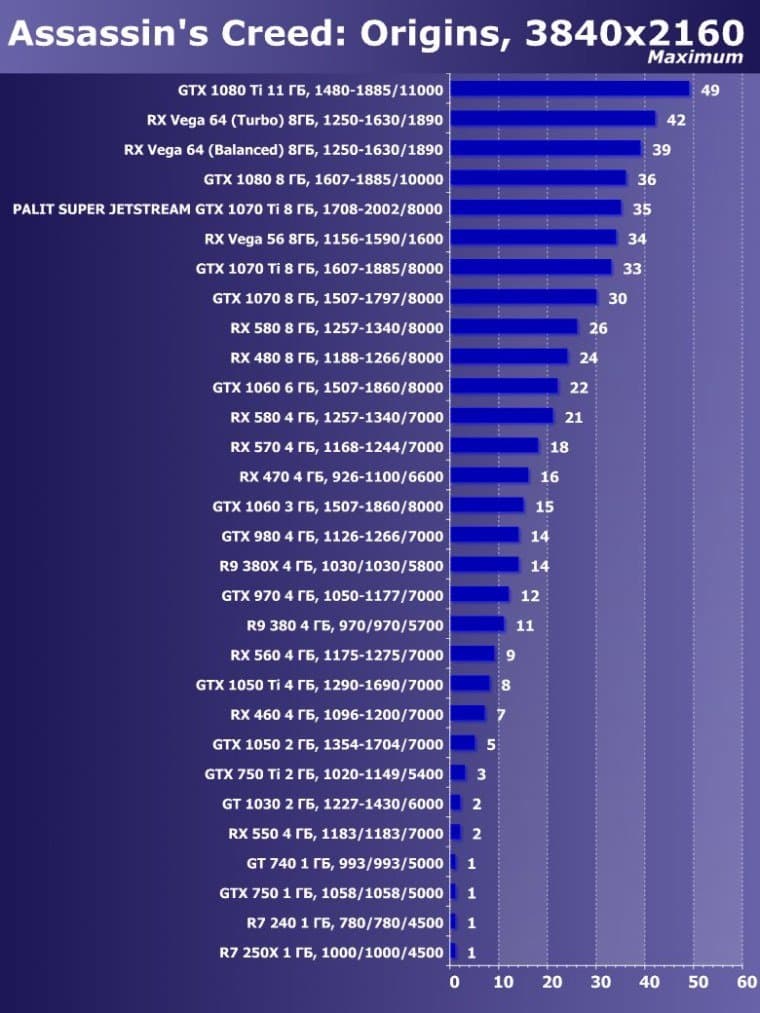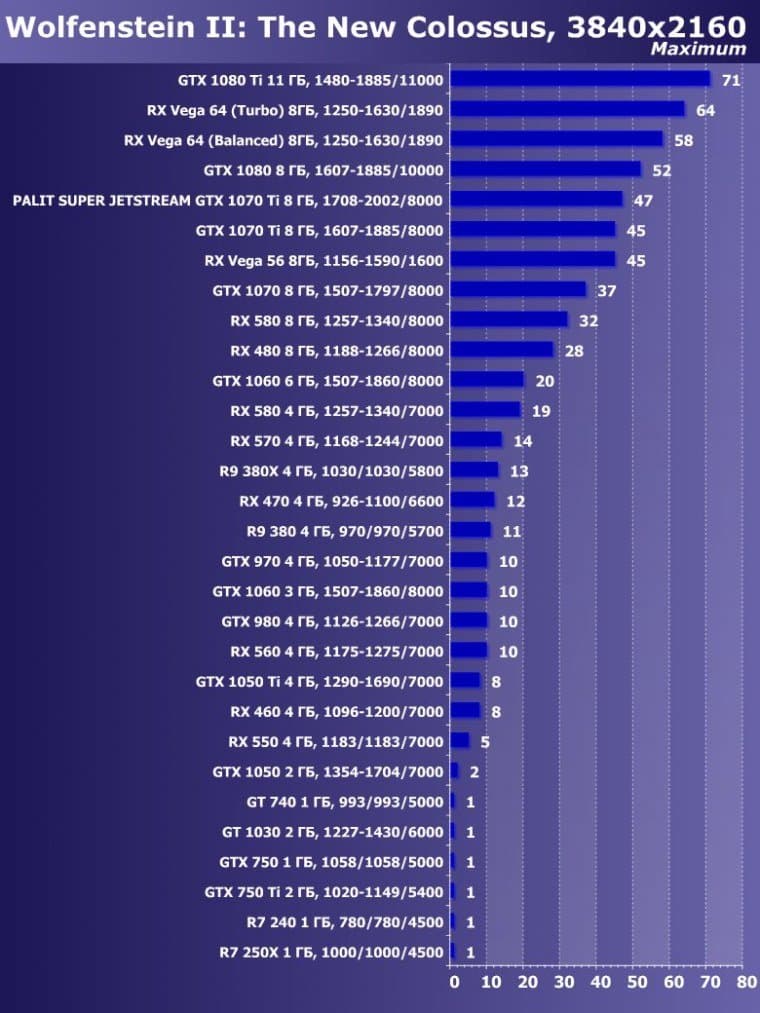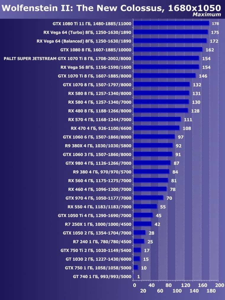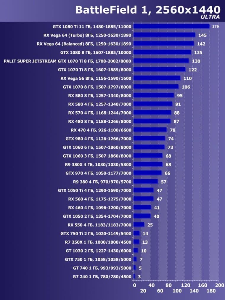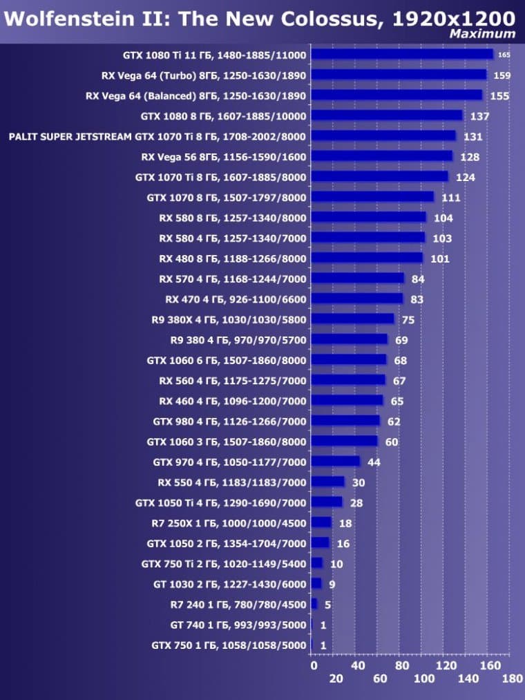 | 14 | Palit Super Jetstream GTX 1070 Ti 8 ГБ, 1708—2002/8000 | 613 | 2390 | 39 000 |