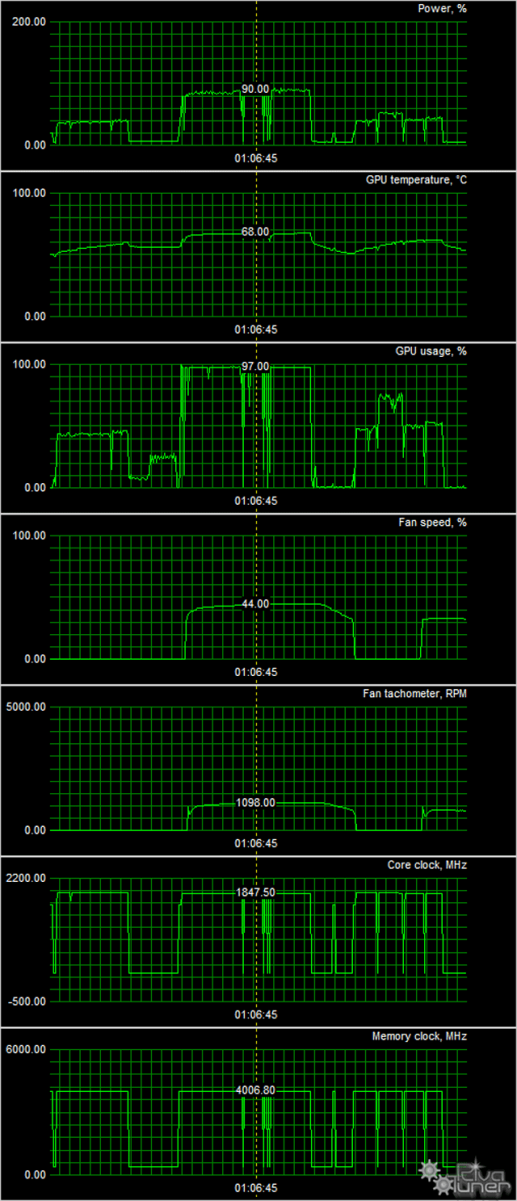 После 6-часового прогона под нагрузкой максимальная температура ядра не превысила 68 градусов, что является очень хорошим результатом для видеокарты такого уровня.