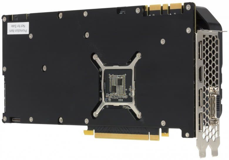 Главной частью кулера являются два пластинчатых никелированных радиатора, соединенные между собой тепловыми трубками, которые впрессованы в медное основание основного радиатора и обеспечивают равномерное распределение тепла по ребрам. Поверх радиаторов установлен кожух с двумя вентиляторами, работающими на одинаковой частоте вращения. Микросхемы памяти охлаждаются основным радиатором, а для охлаждения силовых транзисторов на втором радиаторе есть особая подошва с термоинтерфейсом. С оборотной стороны карта прикрывается специальной пластиной, которая не только обеспечивает жесткость печатной платы, но и участвует в охлаждении, прижимаясь к PCB со стороны силовых элементов через термоинтерфейс.