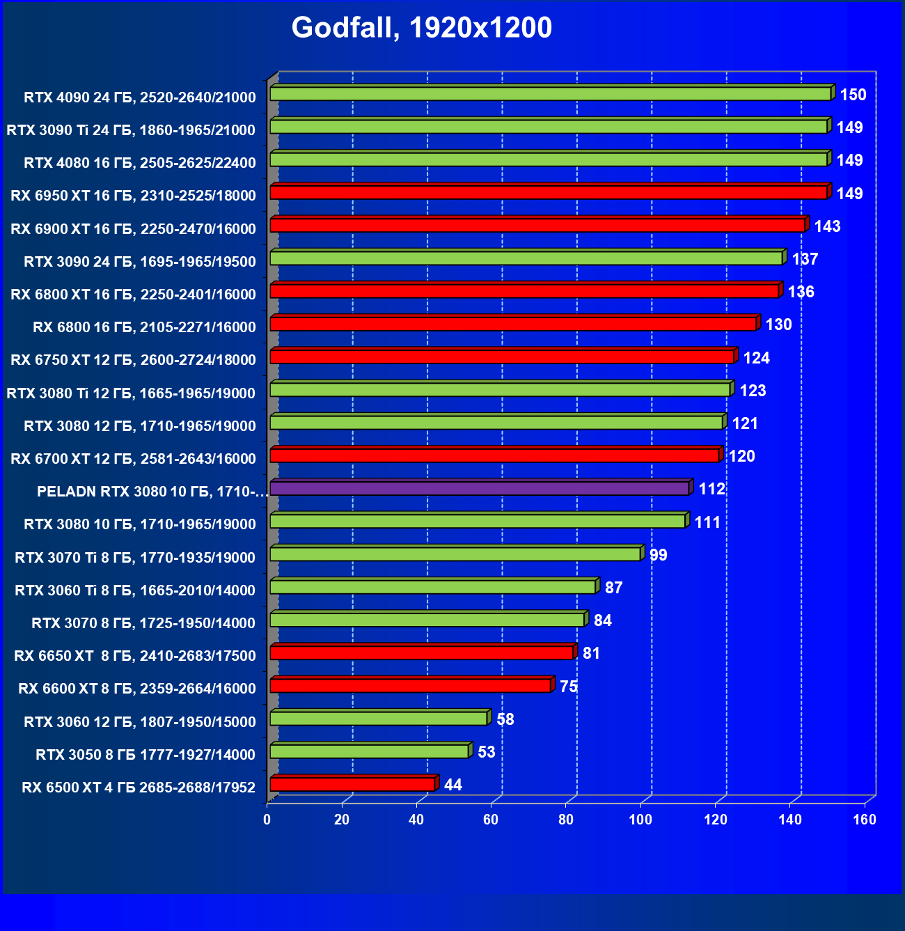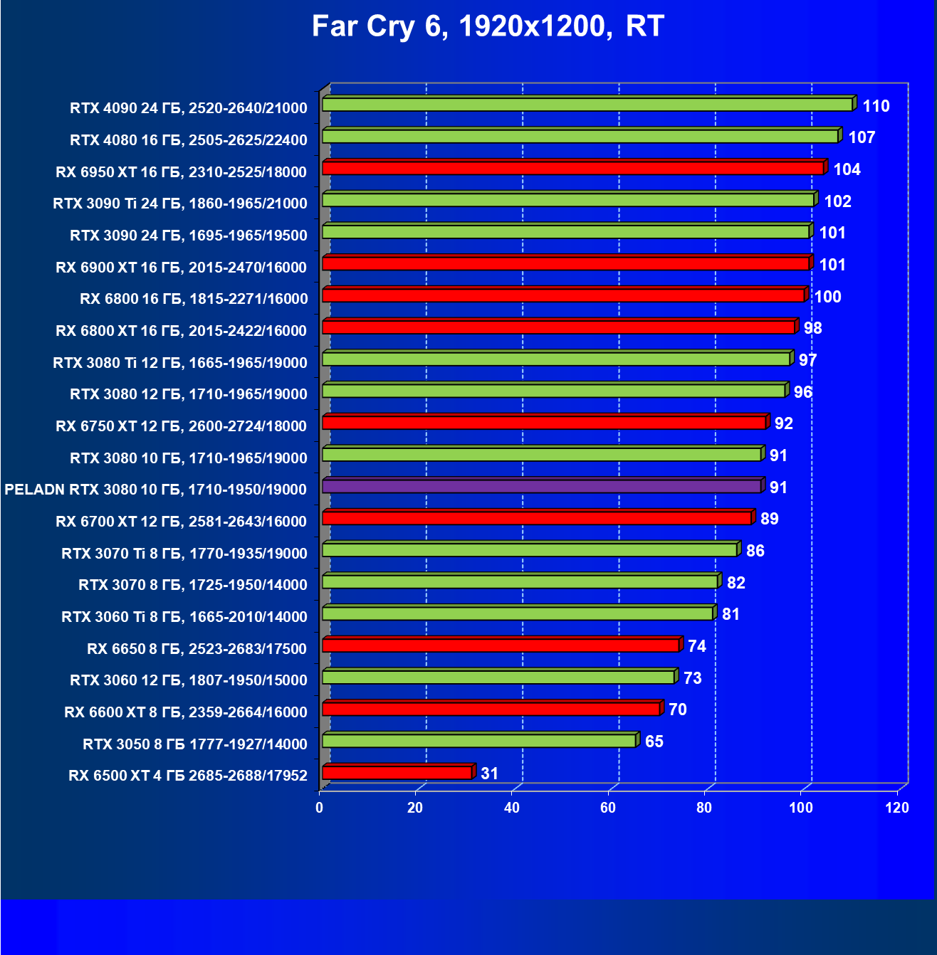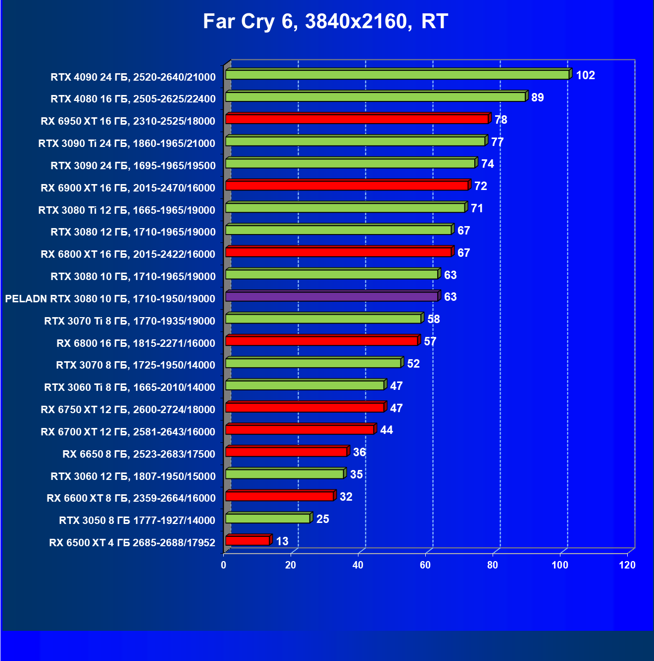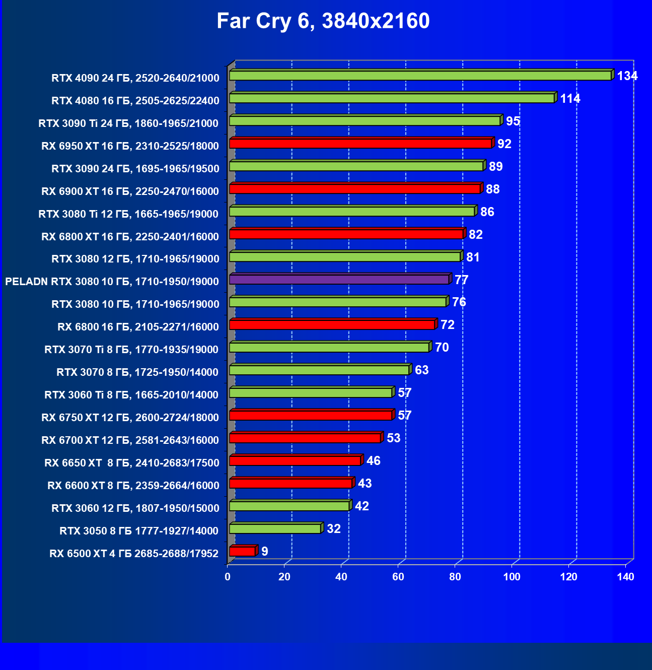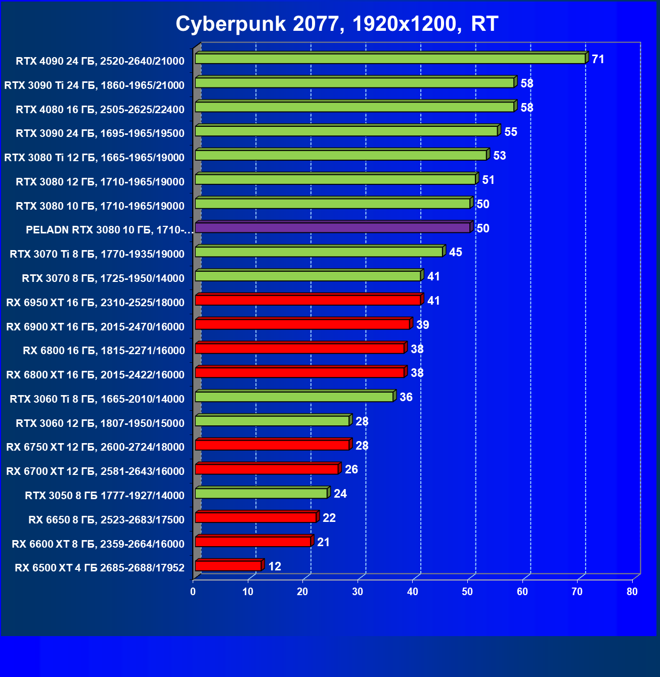 Если говорить о производительности в играх без трассировки лучей, то карта Peladn (она равна референсной в плане скорости), как и в целом RTX 3080 10 ГБ, значительно отстает от мощного, но более дорогого соперника в лице RX 6800 XT, но зато с не меньшим преимуществом опережает равного по стоимости соперника RX 6800. В целом карта Peladn выдает комфортный FPS во многих современных играх без включения трассировки лучей в разрешении 4K.
