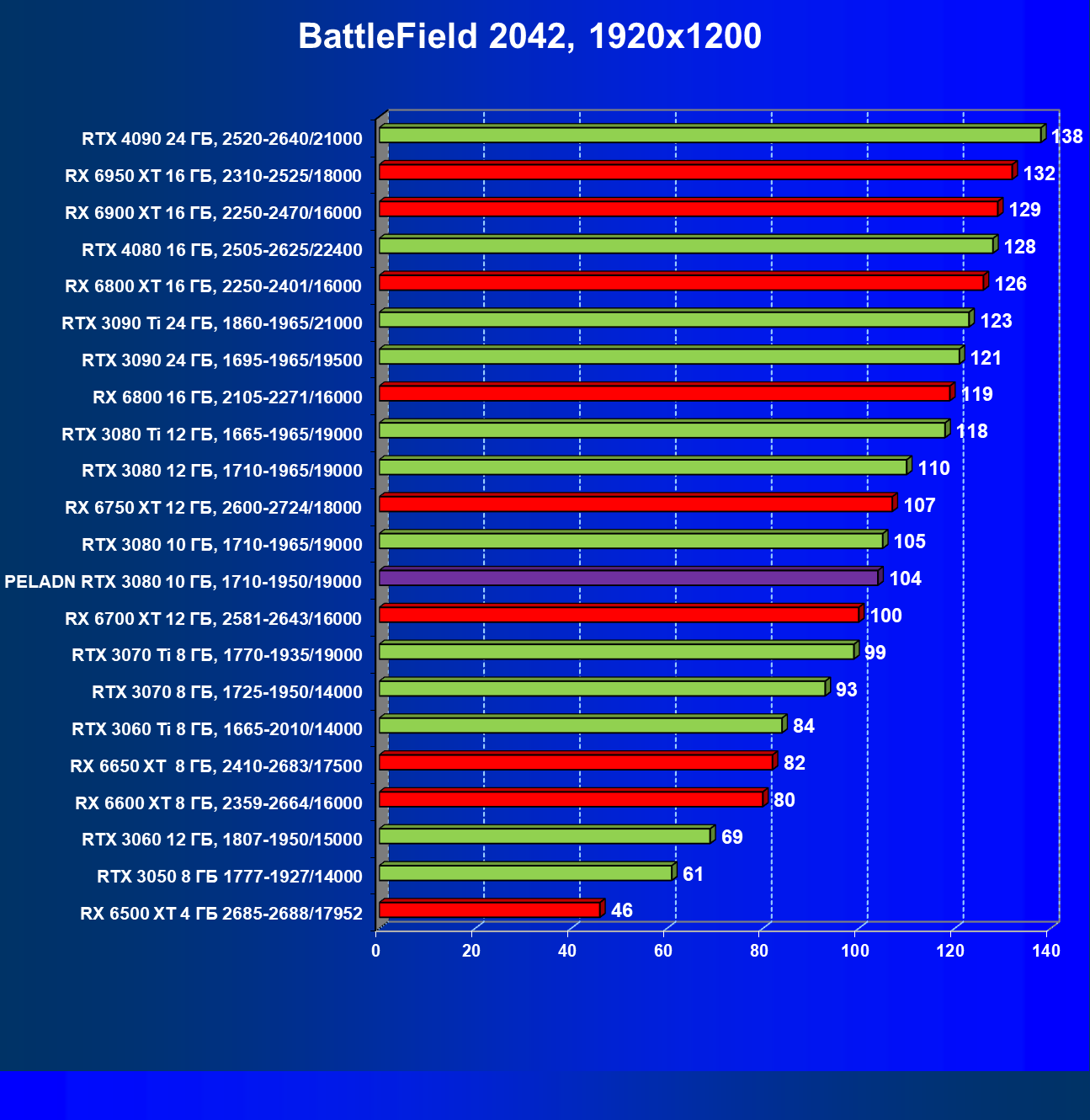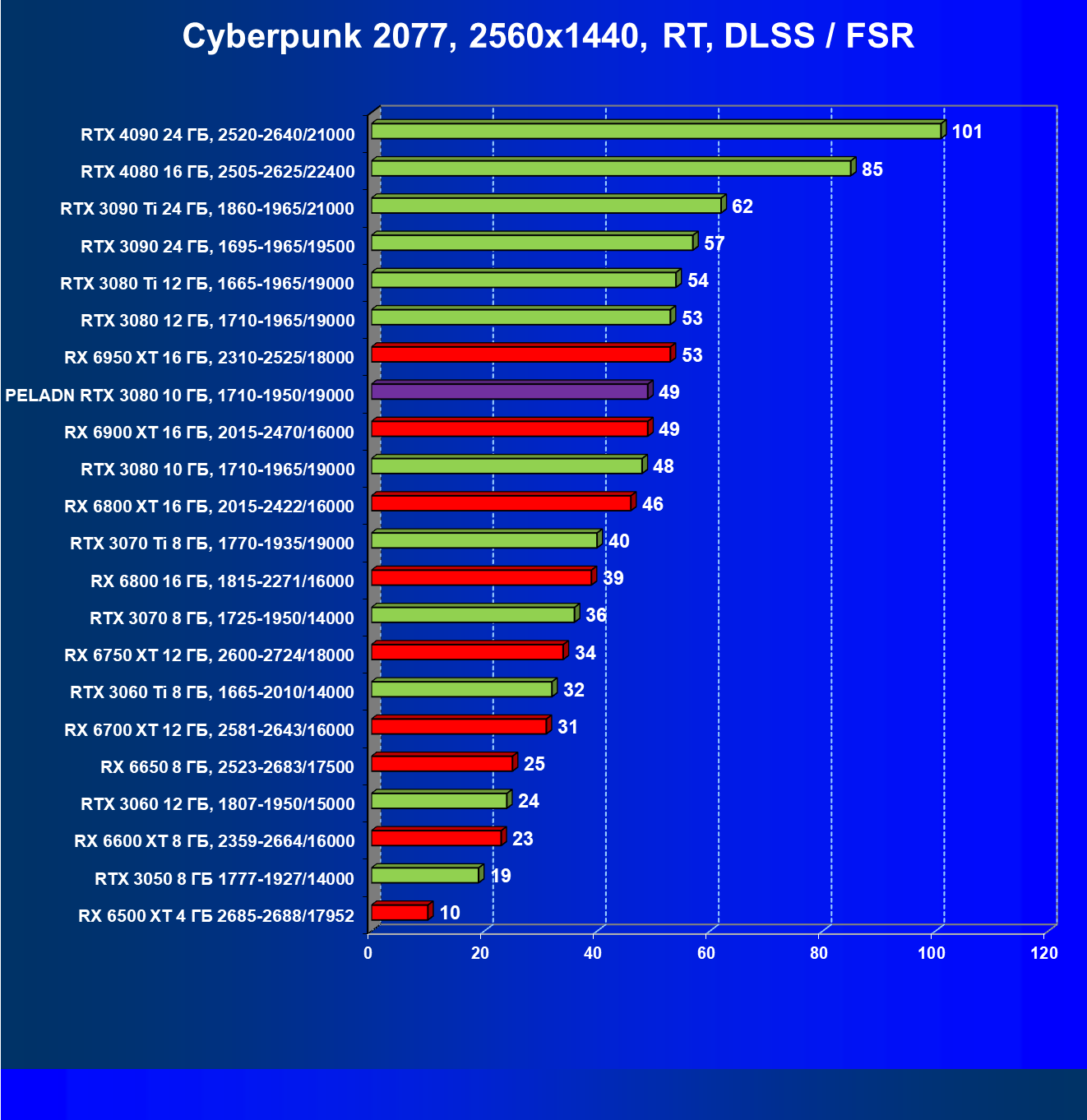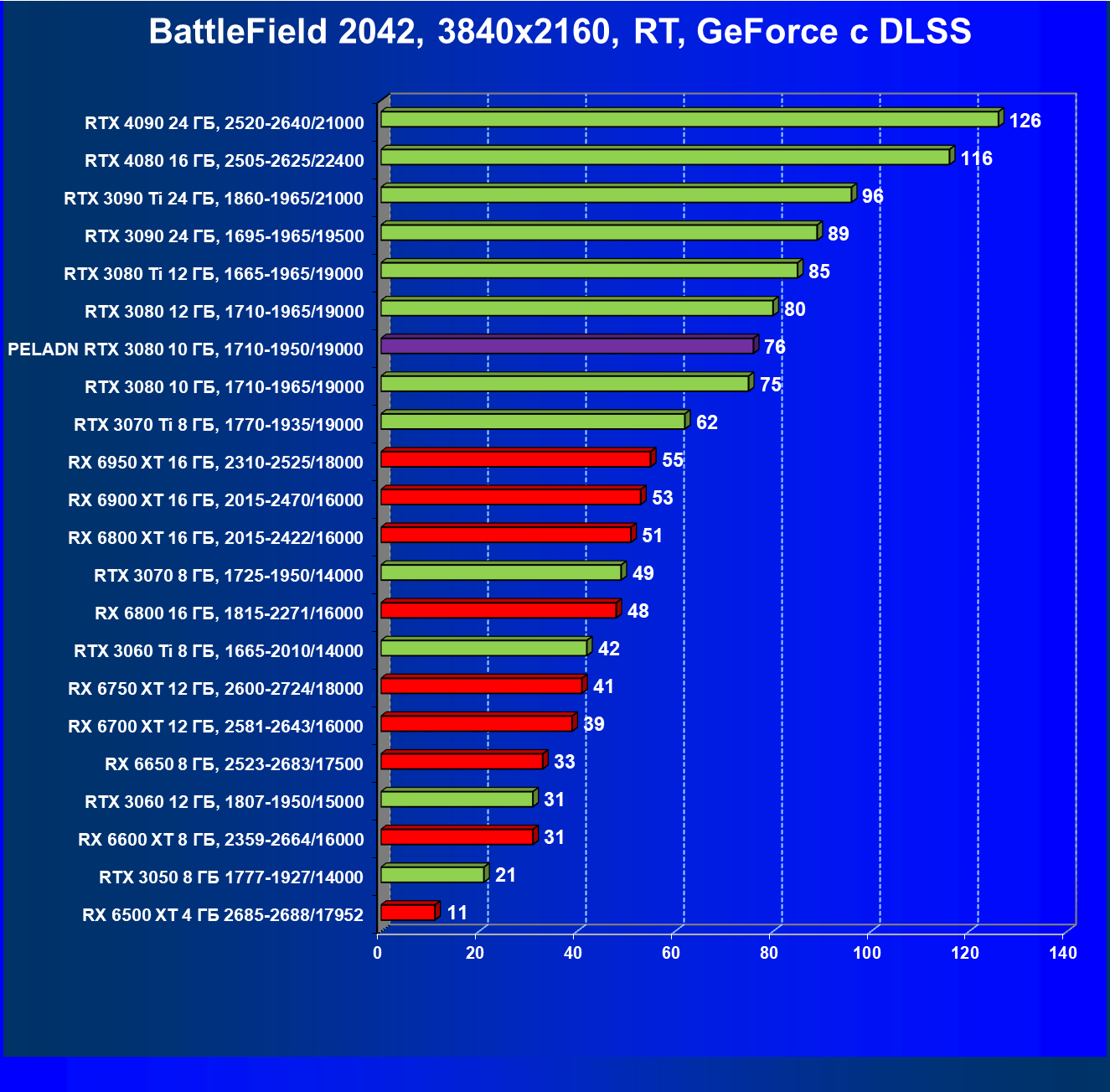 Ускоритель Peladn GeForce RTX 3080 (10 ГБ) близок по производительности к сопернику в лице AMD Radeon RX 6800 XT, оба они нацелены на разрешение 4K при максимальном качестве графики в играх без трассировки лучей. При этом эффективность DLSS выше, чем FSR, поэтому в играх с RT+DLSS производительность RTX 3080 в целом повыше, а цена у рассмотренной нами модели ниже, чем у RX 6800 XT.