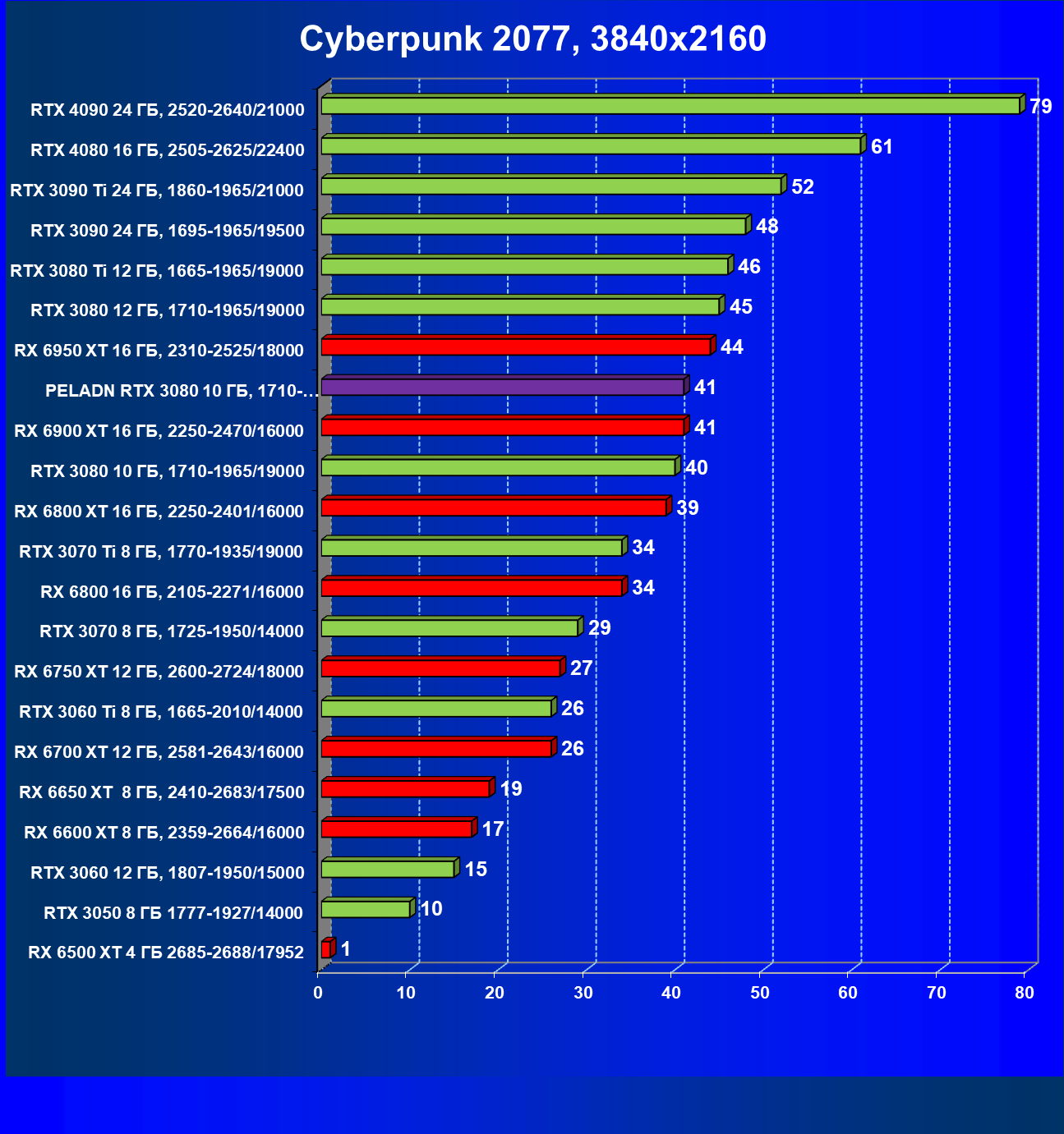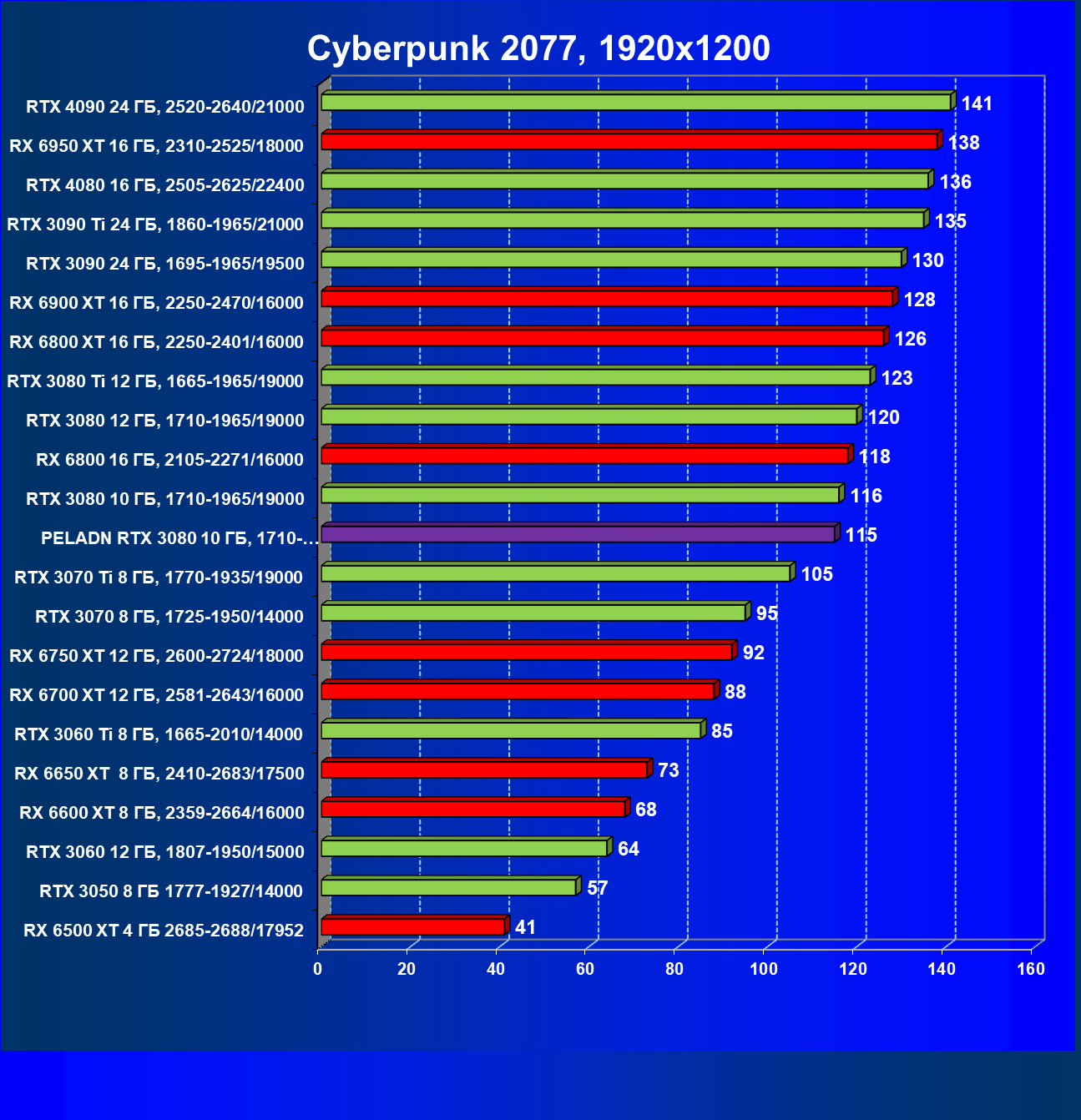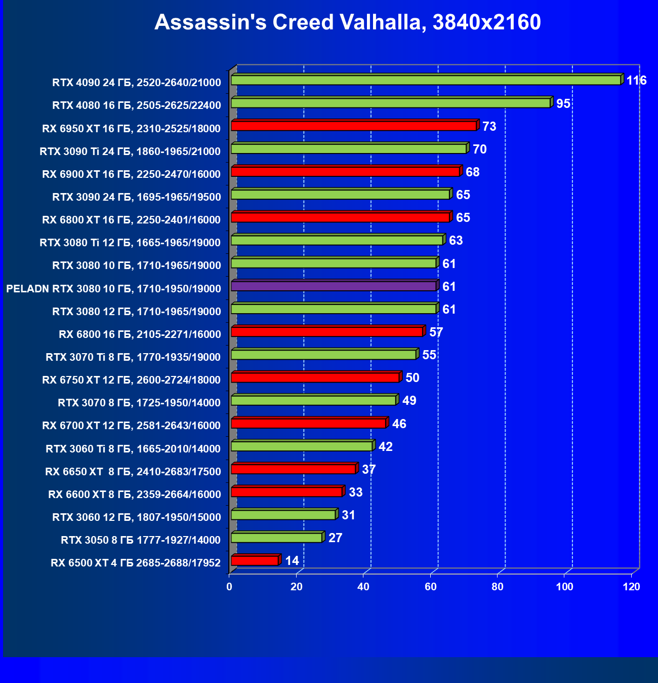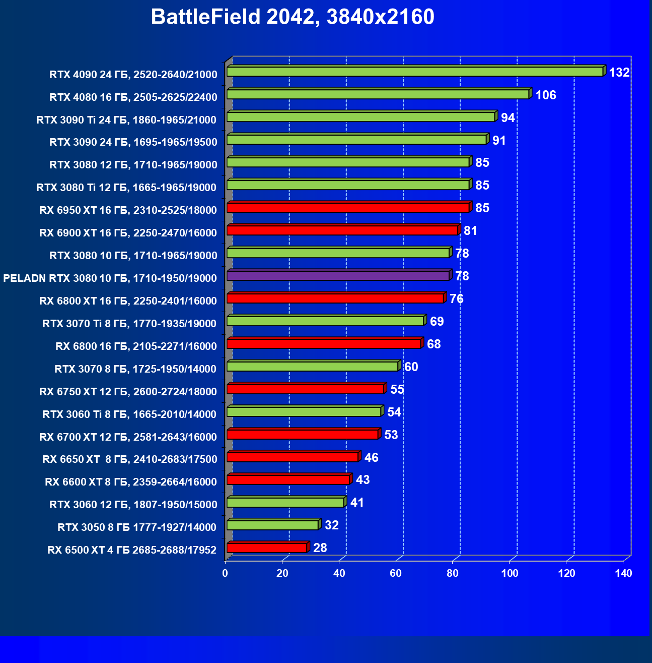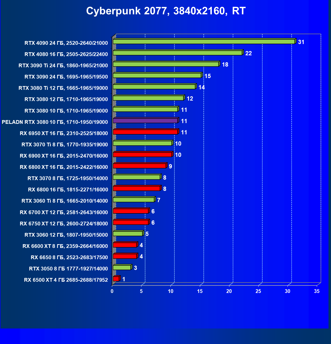 GeForce RTX 3080 (10 ГБ) демонстрирует приличную производительность на ультравысоких настройках графики в разрешении 3840×2160, являясь аналогичной референс-карте по производительности, однако для разгона карта Peladn не приспособлена из-за жестко установленного лимита потребления.