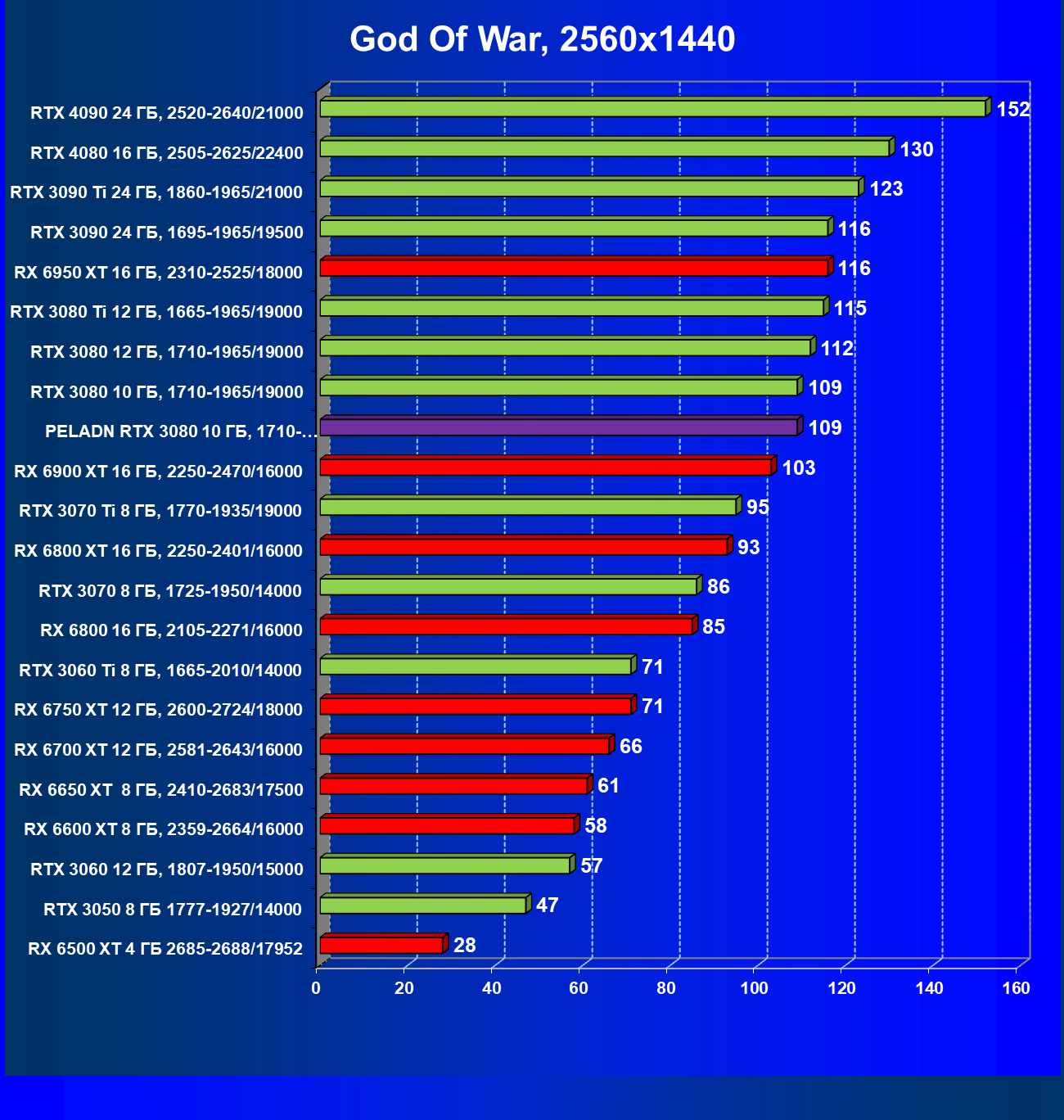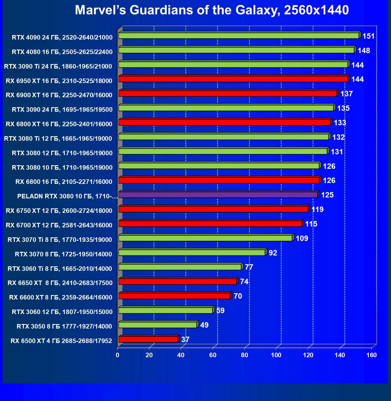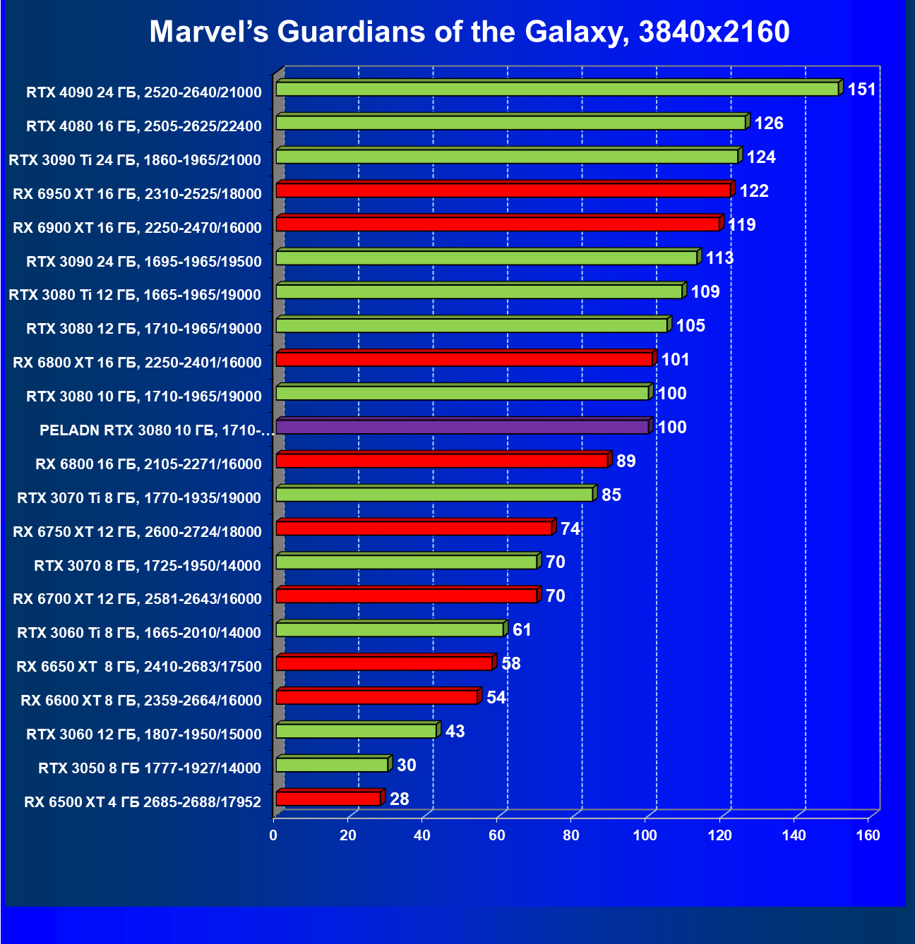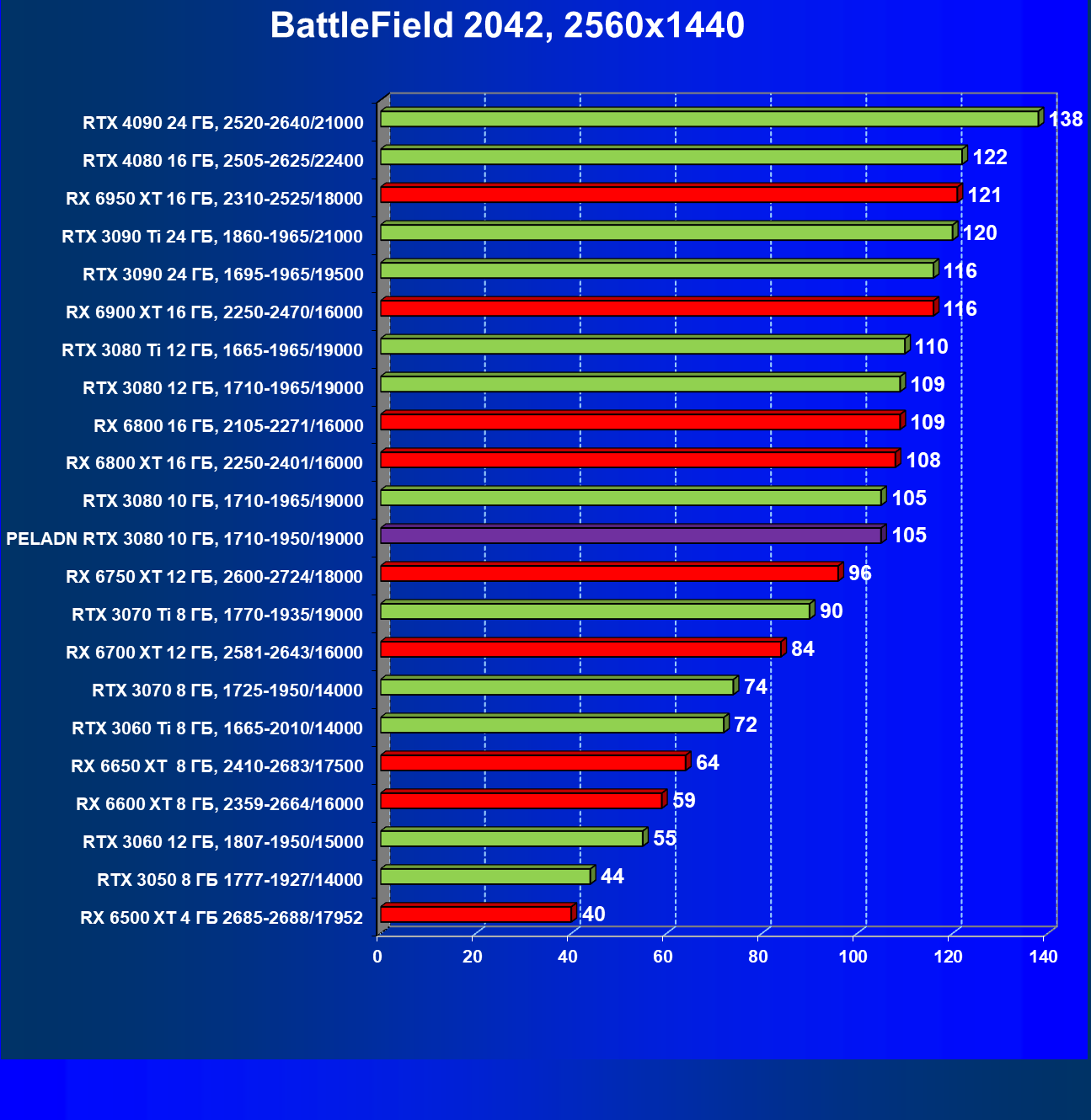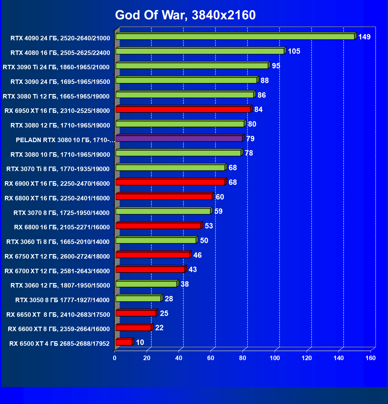 GeForce RTX 3080 (10 ГБ) демонстрирует приличную производительность на ультравысоких настройках графики в разрешении 3840×2160, являясь аналогичной референс-карте по производительности, однако для разгона карта Peladn не приспособлена из-за жестко установленного лимита потребления.