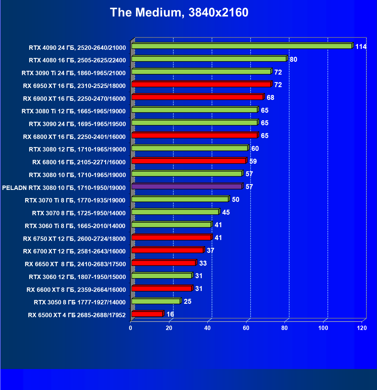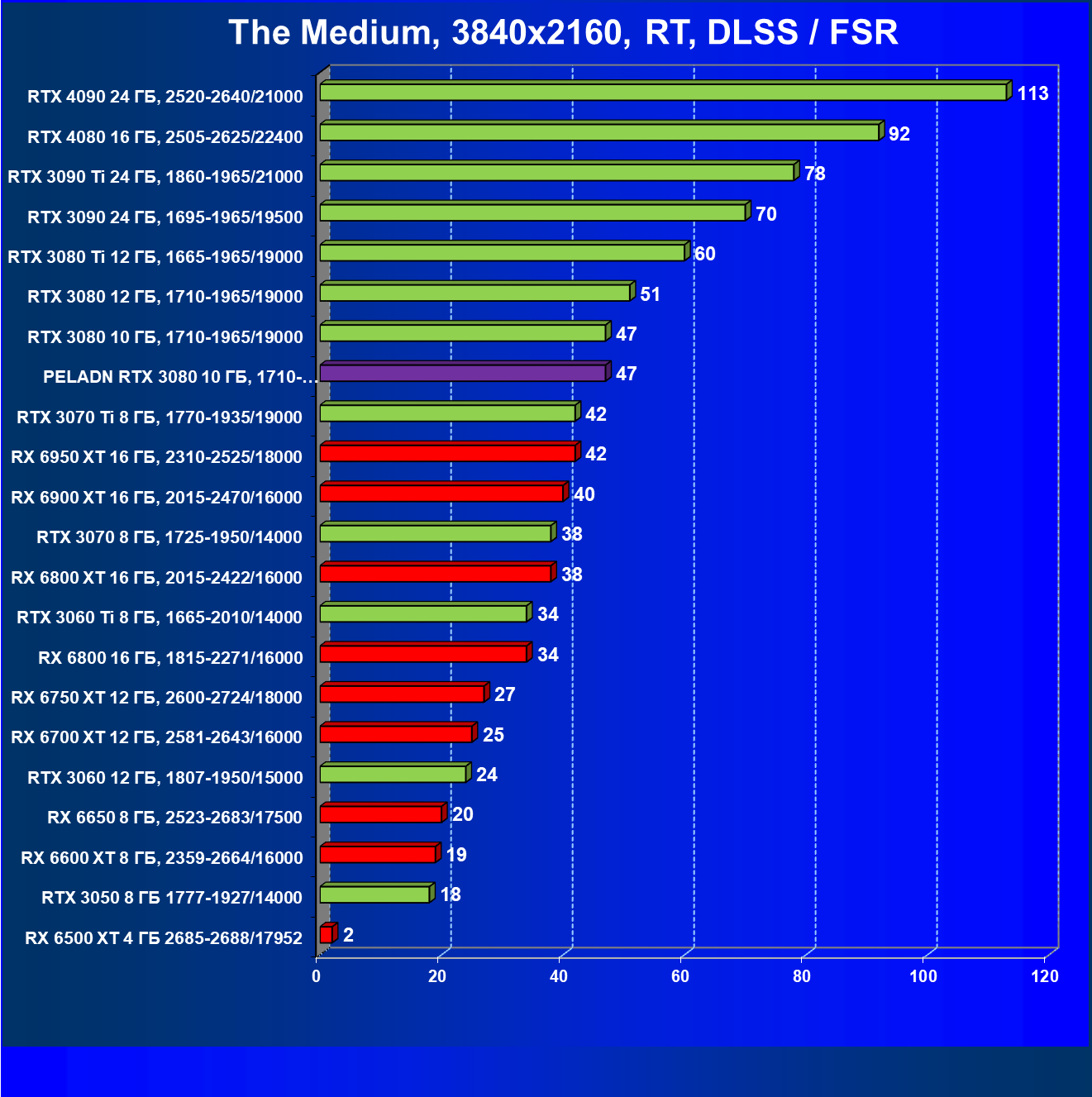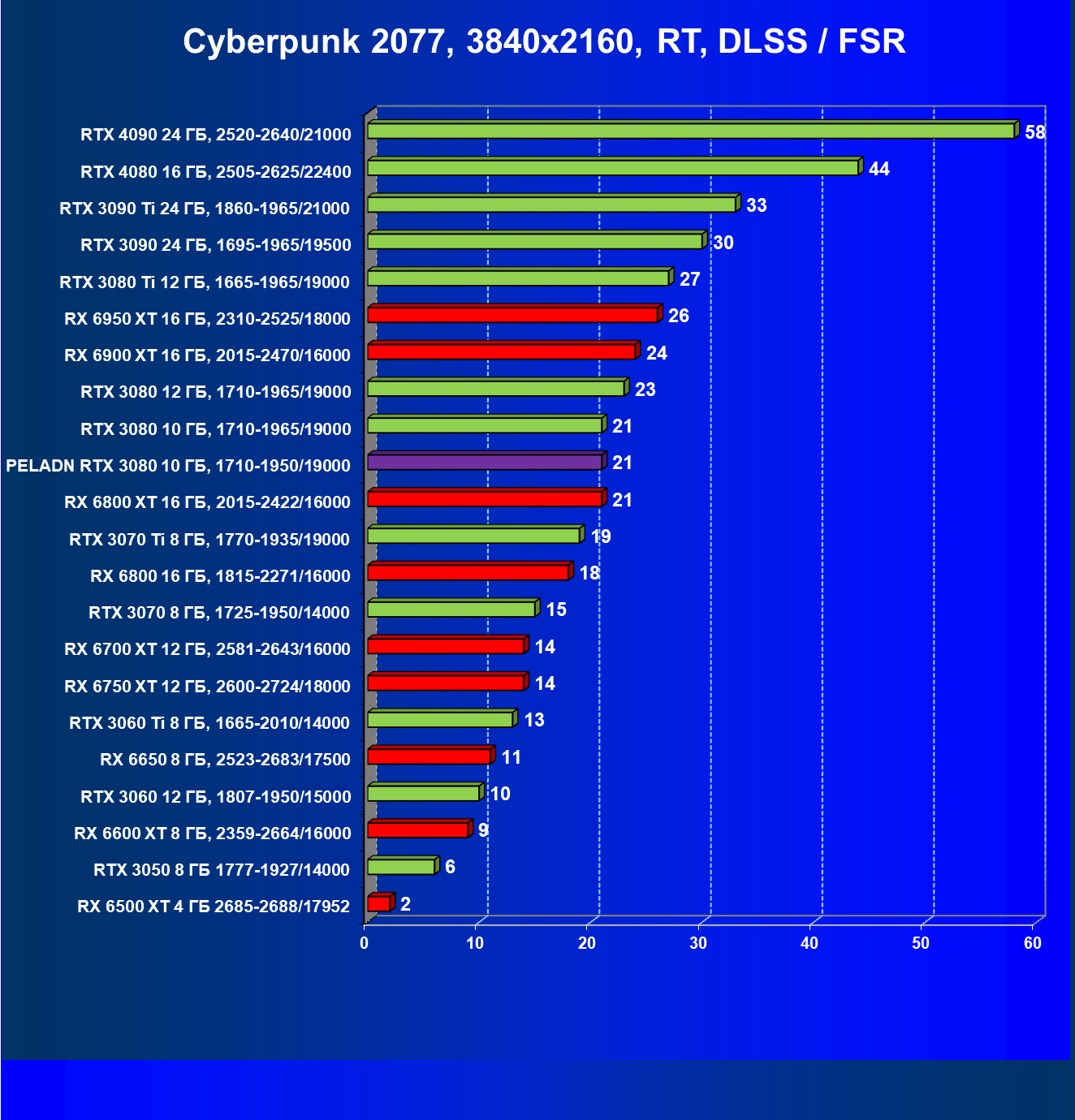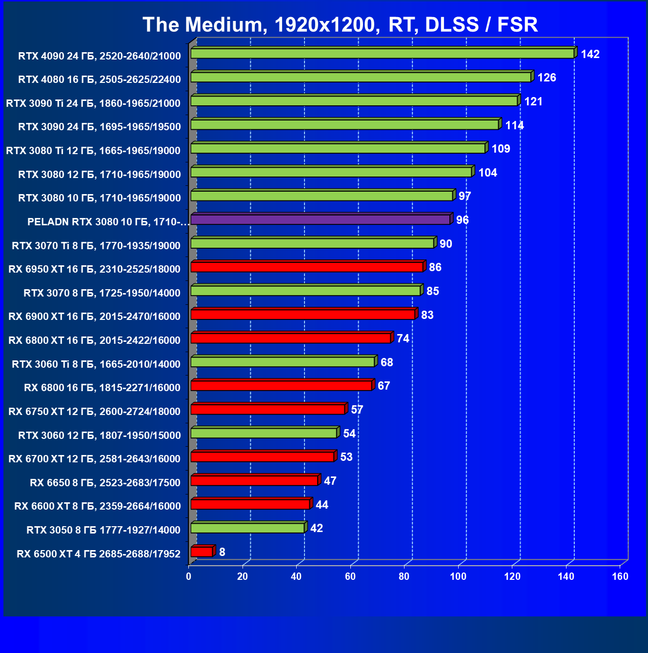 Использование трассировки лучей (RT) даже совместно с FSR немного снизило рейтинги продуктов AMD, поэтому карта Peladn превосходит RX 6800 XT. В целом можем сказать, что и с трассировкой лучей при активном использовании DLSS/FSR GeForce RTX 3080 способен предоставить приличный комфорт в ряде игр в разрешении 4K на высоких настройках графики.