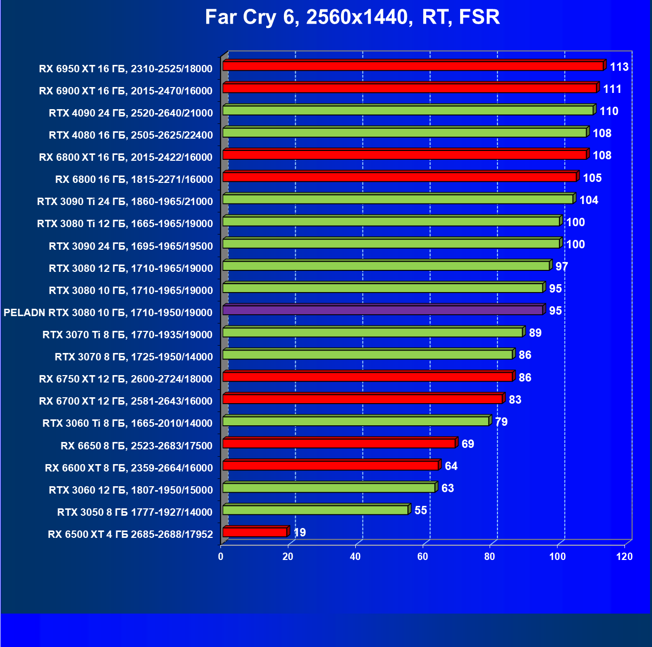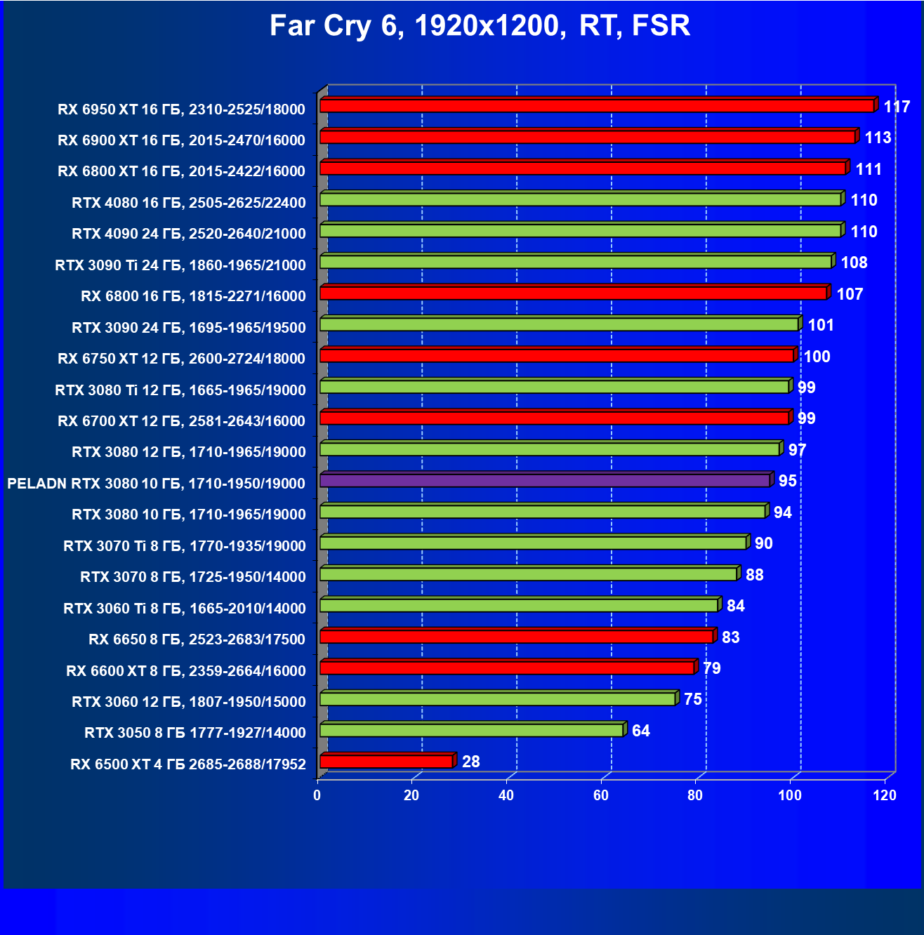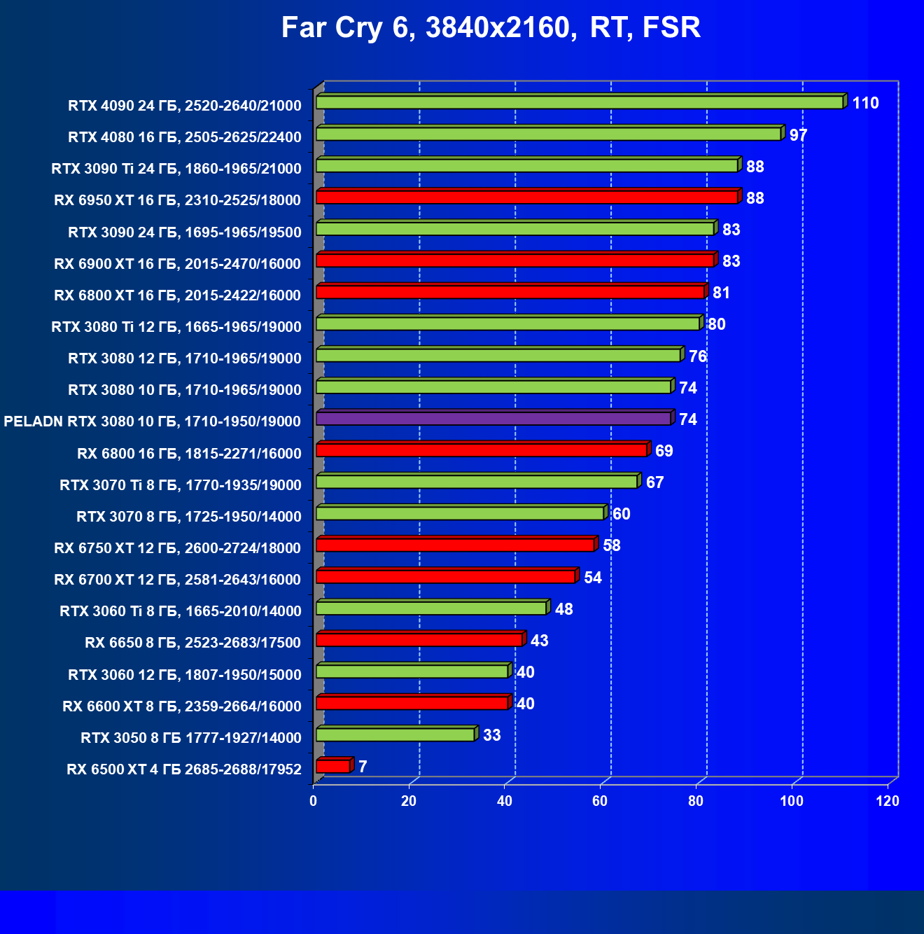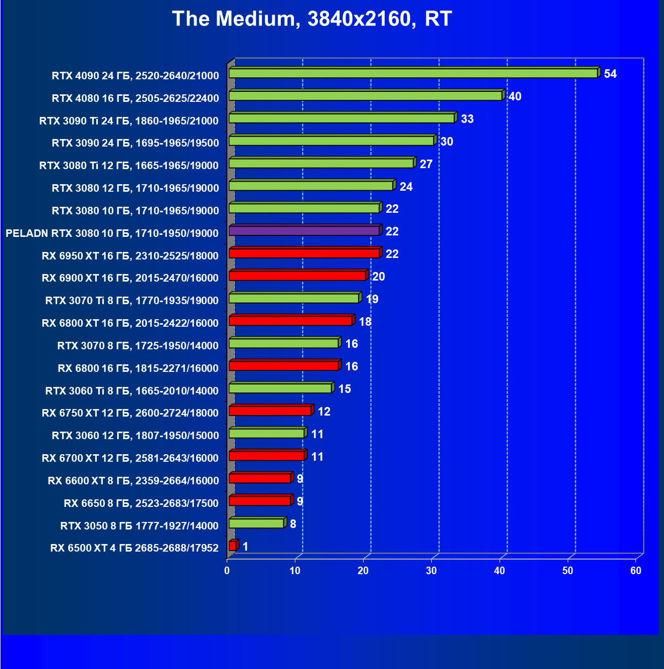 Использование трассировки лучей (RT) даже совместно с FSR немного снизило рейтинги продуктов AMD, поэтому карта Peladn превосходит RX 6800 XT. В целом можем сказать, что и с трассировкой лучей при активном использовании DLSS/FSR GeForce RTX 3080 способен предоставить приличный комфорт в ряде игр в разрешении 4K на высоких настройках графики.