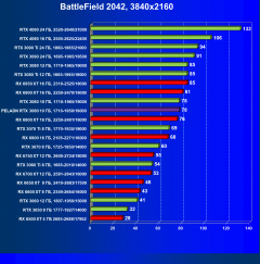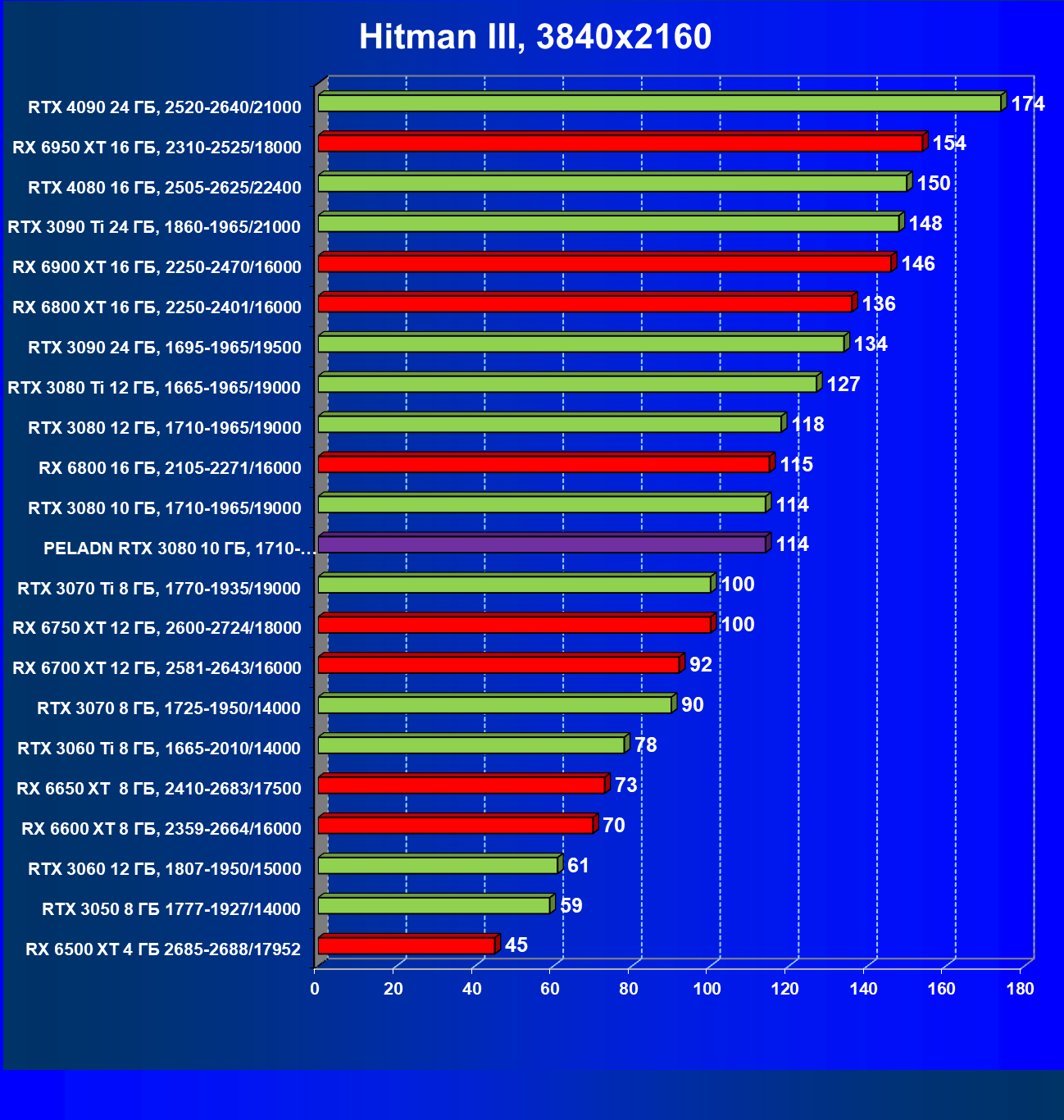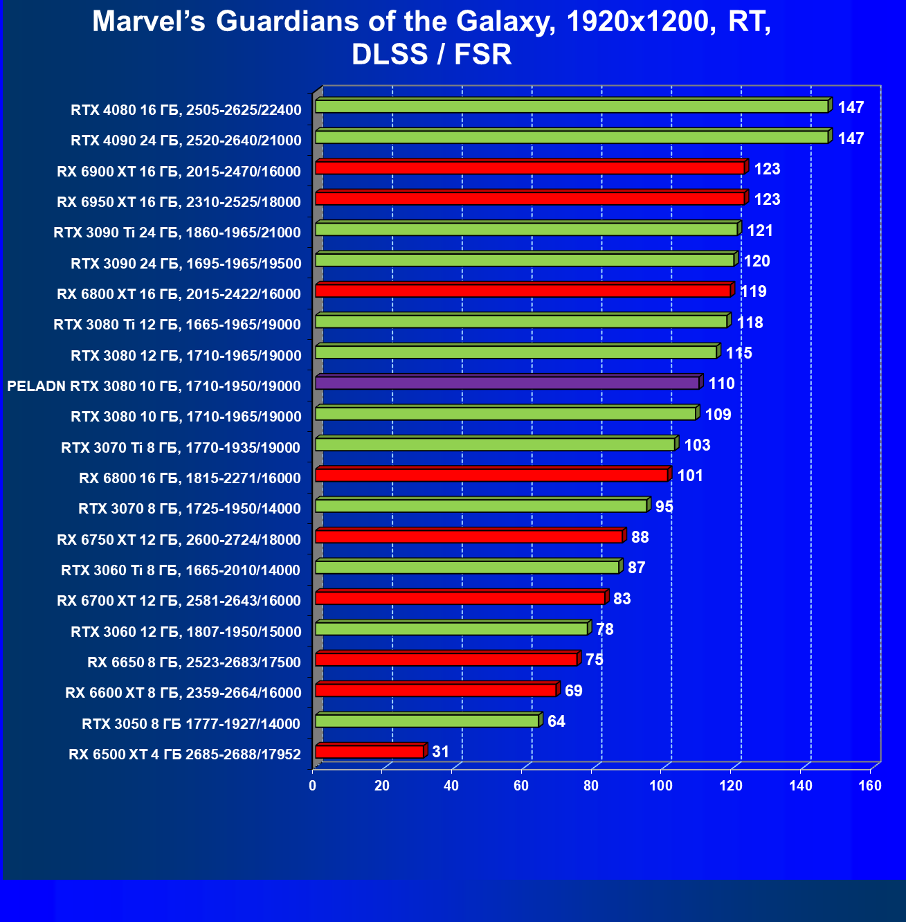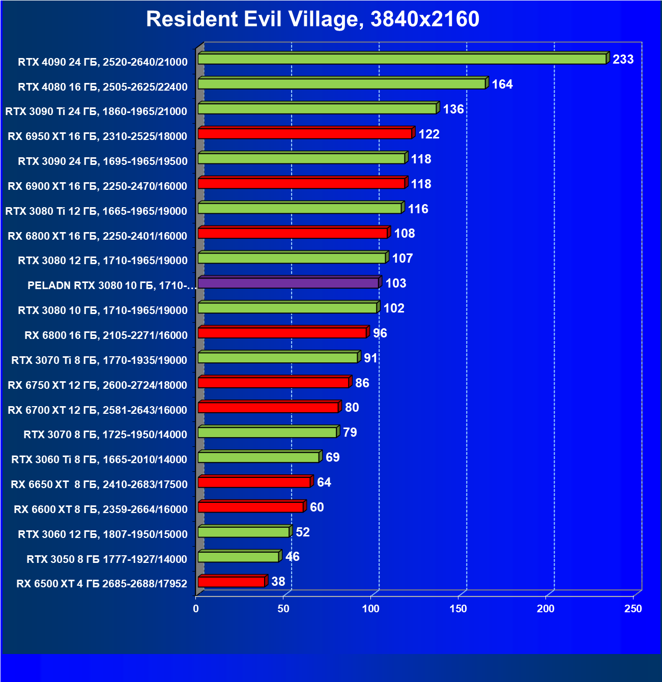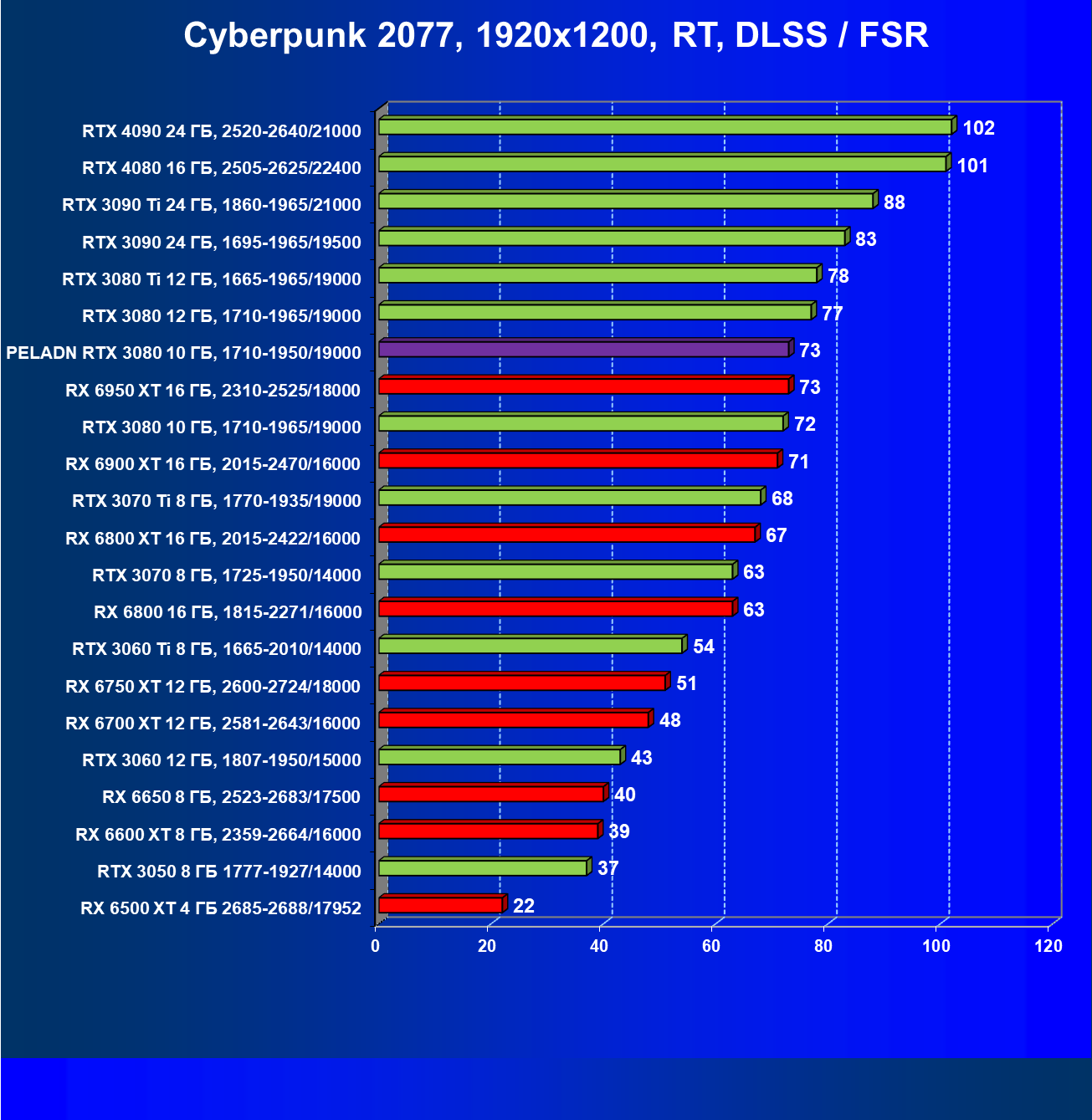 Использование трассировки лучей (RT) даже совместно с FSR немного снизило рейтинги продуктов AMD, поэтому карта Peladn превосходит RX 6800 XT. В целом можем сказать, что и с трассировкой лучей при активном использовании DLSS/FSR GeForce RTX 3080 способен предоставить приличный комфорт в ряде игр в разрешении 4K на высоких настройках графики.
