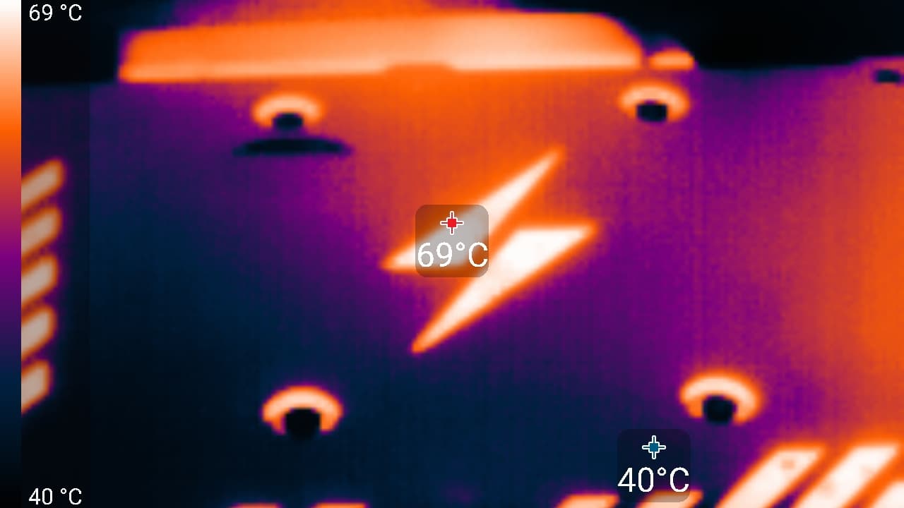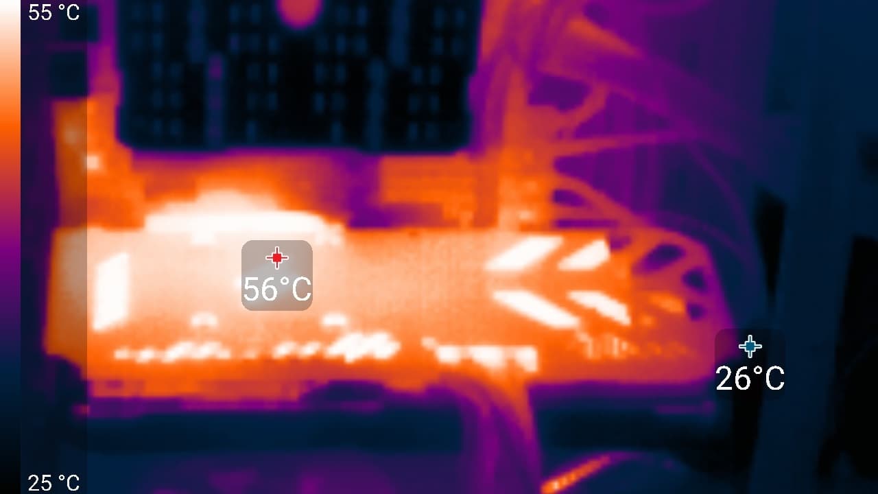 После 2-часового прогона под нагрузкой максимальная температура ядра не превысила 82 градусов, что выше нормального показателя для карты с такой производительностью. Максимальное энергопотребление составило 318 Вт, а максимальный нагрев наблюдался в центре PCB, но основным источником нагрева являются микросхемы памяти, которые нагревались до 84 °C.