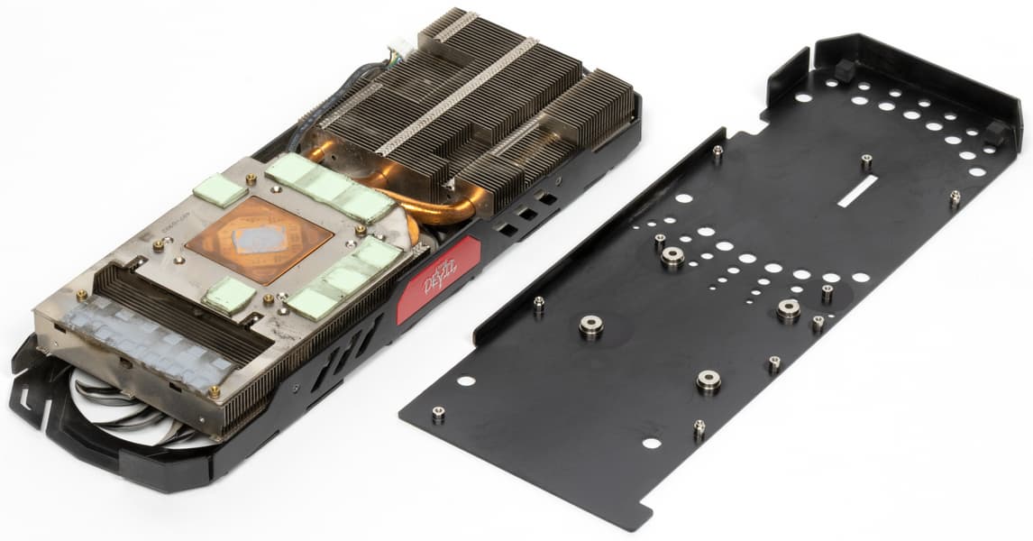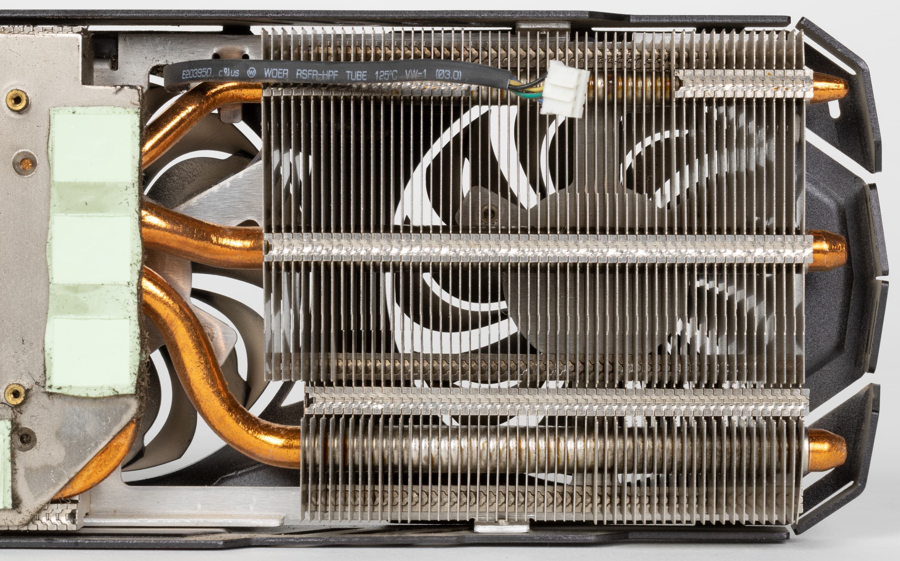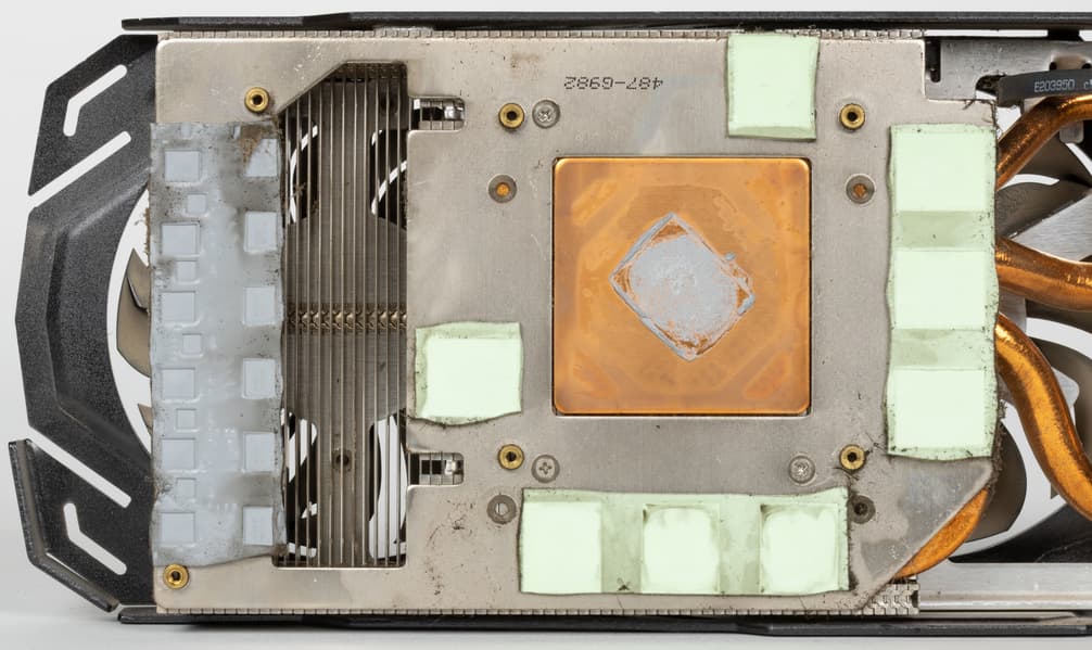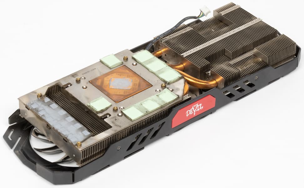 Охлаждение у видеокарты Powercolor — трехвентиляторное с теплоотводными медными трубками, и прижимная пластина к GPU тоже медная. Термопрокладки после выхода карты в свет ни разу не вскрывалась, и после трех лет майнинга выглядят «жизнью помятыми», но все еще достойными.