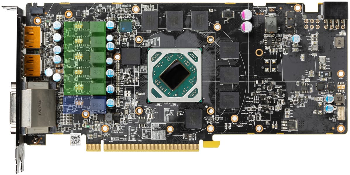 Давайте ниже детально рассмотрим видеокарту без радиатора охлаждения. Синим цветом отмечена одна фаза питания микросхем памяти, а зеленым — 5 фаз питания.