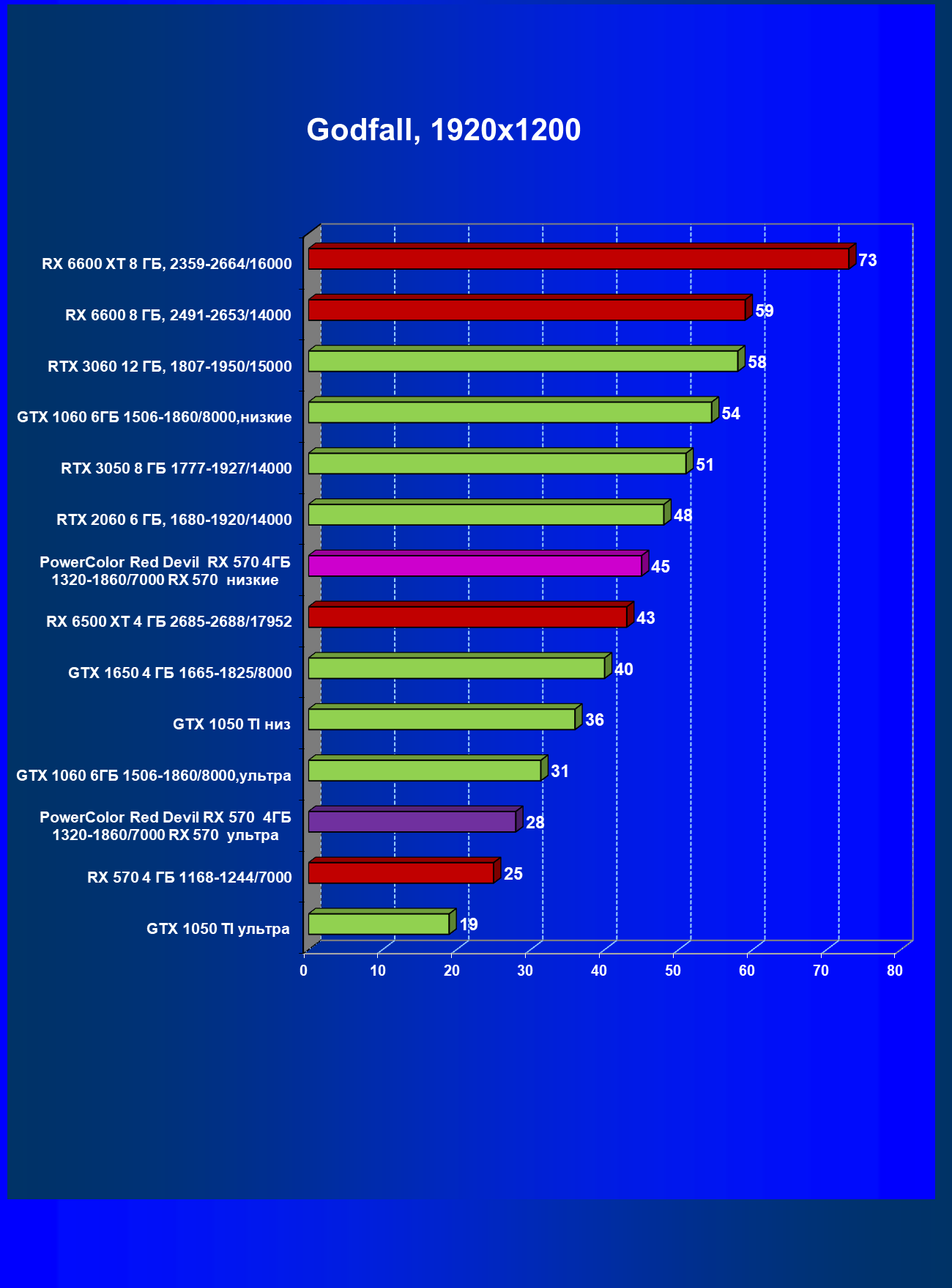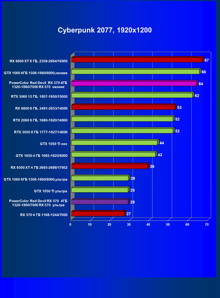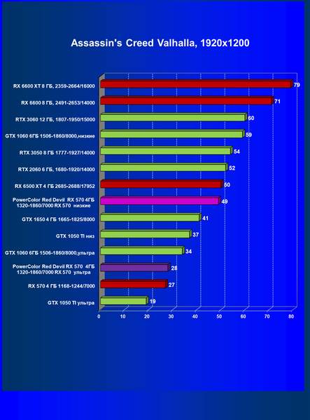 | RX 6600 XT 8 ГБ, 2359—2664/16000 | 27 | 178 | 66 000 |