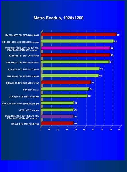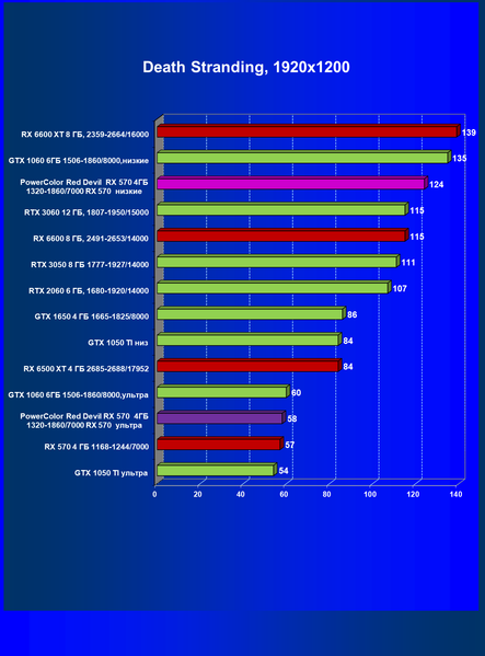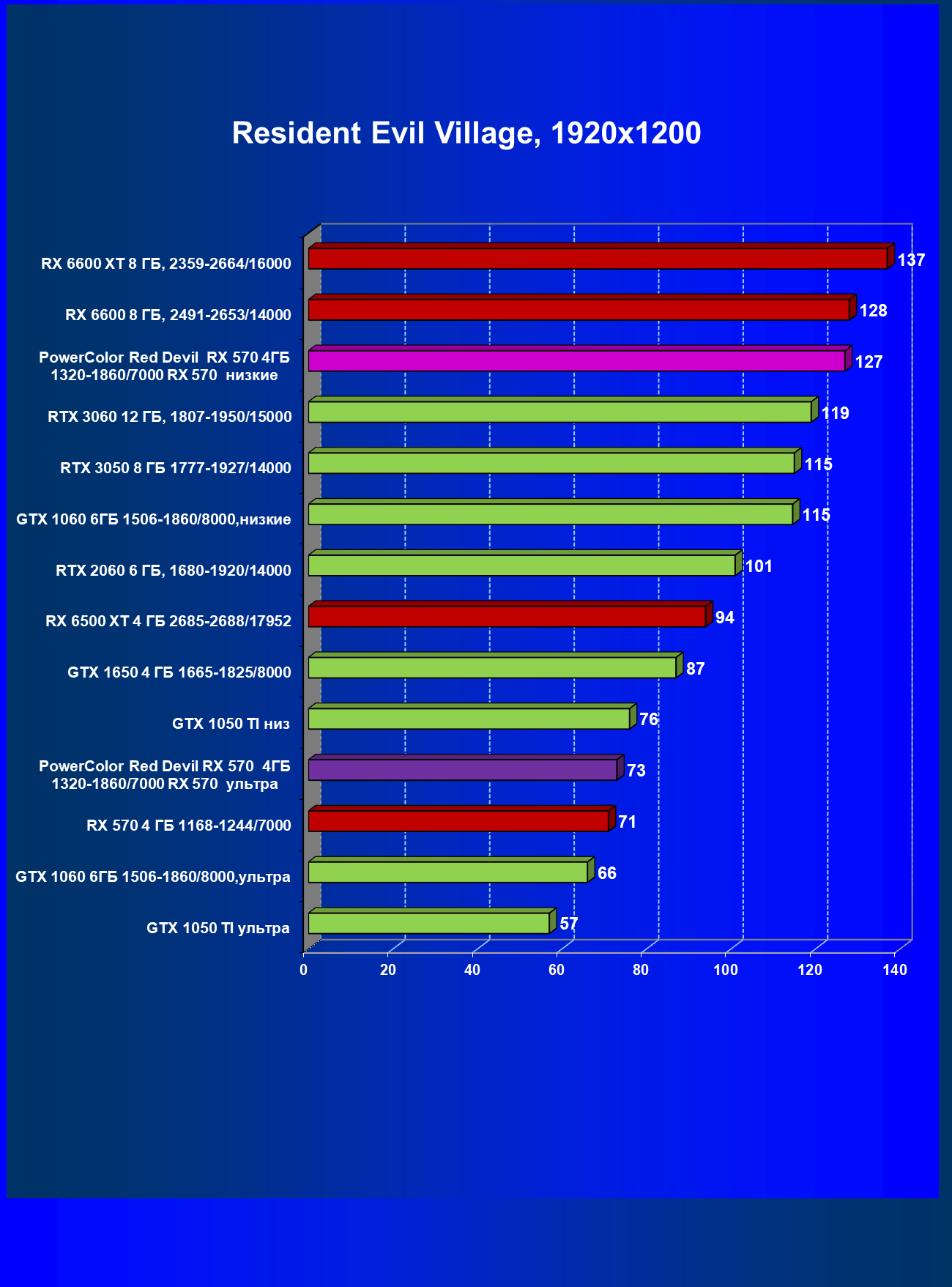 Из-за того, что у продукта Powercolor частоты работы чуть-чуть выше референс — номинала, он оказался выше в нашем рейтинге, и за счет заводского разгона по производительности приближен к GTX 1060. Видеокарта отлично себя показывает в разрешении Full HD, но на низких настройках графики (мы помним, что речь идет о самых новых и очень сложных по графике популярных играх). При этом в некоторых играх на высоких или средних настройках эта карта все же неплохо тянет.