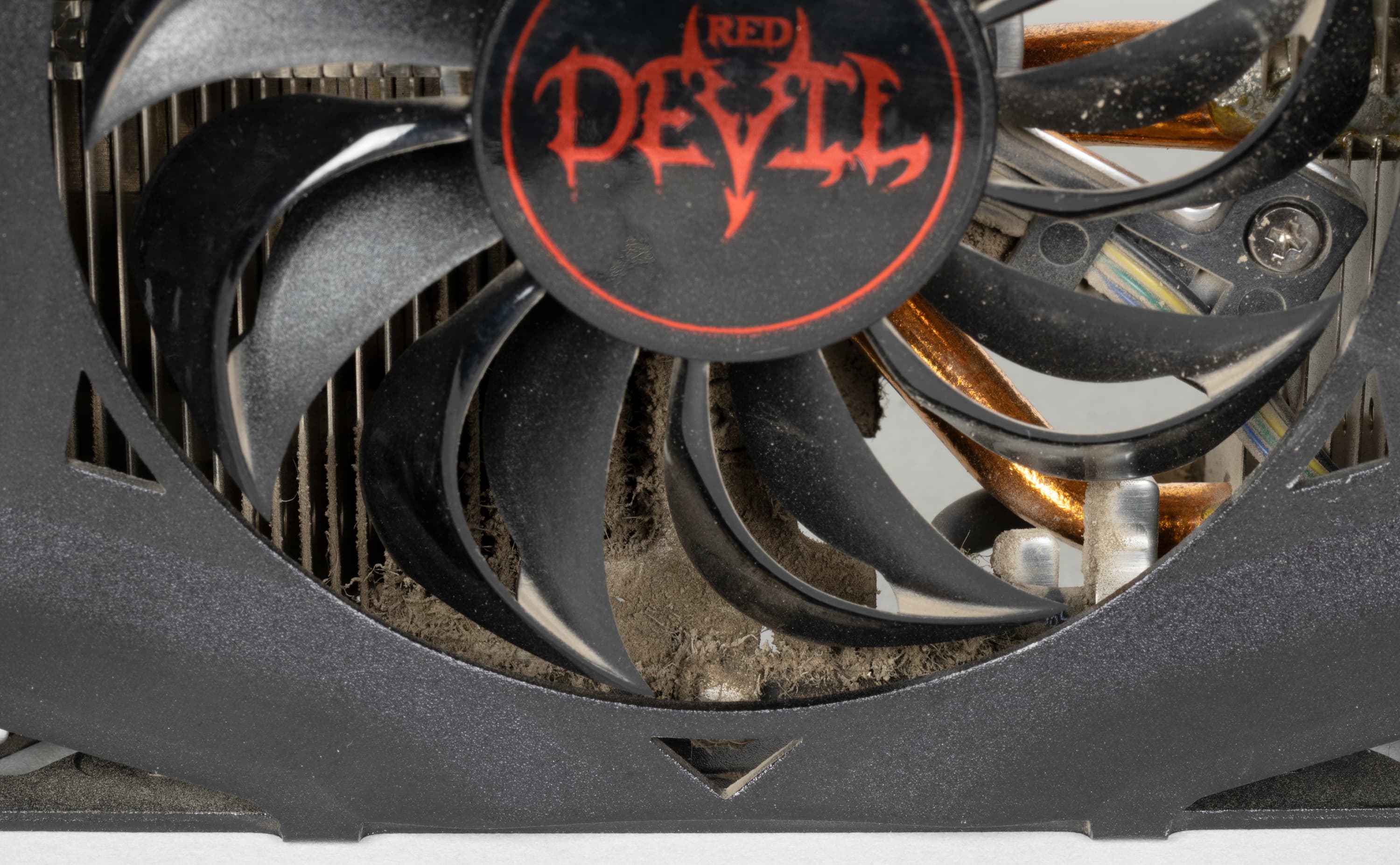 На одном из болтов установлена гарантийная пломба. Карта не вскрывалась. Мы увидим как видеокарту, уже очищенную от «трудовых мозолей», так и всю прелесть пыльной видеокарты. Вам предстоит увидеть мощный «экшен». Сначала мы рассмотрим ускоритель и его микросхемы, фазы и их контроллеры. Небольшой аванс я все же оставлю). На лопастях видна пыль.