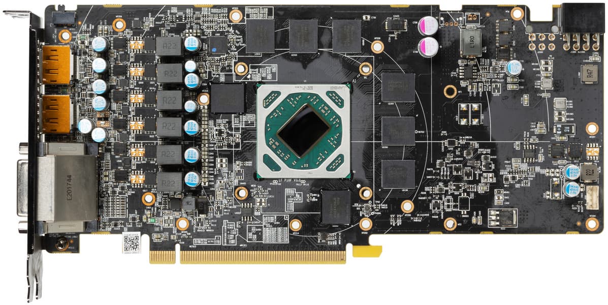 Все это установлено на прилично большом радиаторе, который охлаждает графическое ядро и силовые элементы схемы питания. Очевидно, что СО по наследству досталась от более старших решений уровня RX 580/590, поэтому для такой карты выглядит явно немного избыточной.