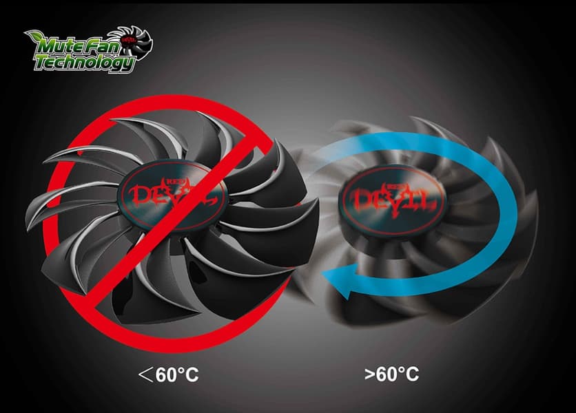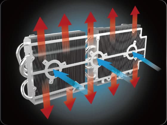 Поверх радиатора имеется кожух с тремя 80-мм вентиляторами. Технология Mute Fan интеллектуально отключает вентилятор при температуре ядра ниже 60 ℃, что автоматически понижает шум, и можно не выключать ПК даже когда отдыхаете в ночное время.