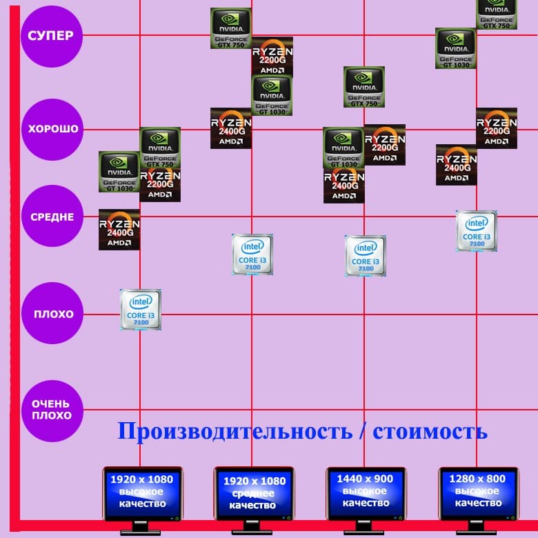 - Разрешение 1920×1080 на средних настройках качества: все системы (кроме Intel Core i3-7100) обеспечивают уже просто космическую играбельность, а встроенная графика Intel — хорошую.