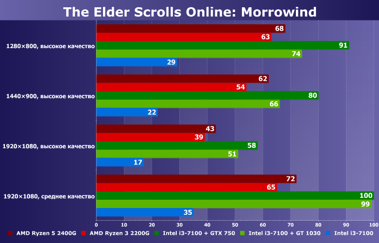 Игра The Elder Scrolls Online: Morrowind хорошо подходит для ПК начального уровня. Некоторым из выбранных систем разрешение 1920×1080 покоряется даже на высоких настройках, и тут явно видно превосходство связок Intel+Nvidia, тогда как платформы AMD «танцуют» почти на минимуме играбельности (про «ясельную» графику Intel мы молчим). А вот если выбрать средние настройки качества в том же разрешении Full HD, то все «основные» конфигурации показывают прекрасные результаты, и даже Intel Core i3 в одиночестве неплох. В более низких разрешениях даже на высоких настройках у участников всё очень хорошо (кроме «интеграшки» Intel, там не очень). В целом, еще раз видим, что в «дуэтах» с GeForce GT 1030 и GTX 750 платформа Intel Core i3-7100 быстрее решений AMD.