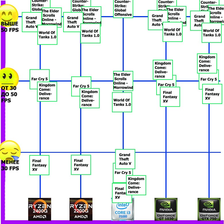 Итак, судя по результатам ранее протестированных «в новом цикле» игр, платформа AMD Ryzen 5 2400G все еще «рулит», правда уже не так однозначно (в данной игре хорошо видно лидерство «дуэтов» Intel+Nvidia). И тем не менее, в целом все же, наверное, выгоднее покупать AMD Ryzen 5 2400G, чем систему с дискретной графикой вроде GTX 750. А платформа AMD Ryzen 3 2200G по результатам тестирования в 7 играх по-прежнему является самым выгодным приобретением, поэтому не имеет смысла обращать внимание на связки типа Core i3-7100 + GT 1030.