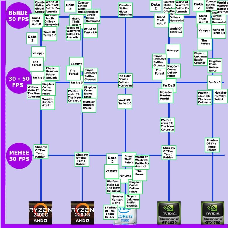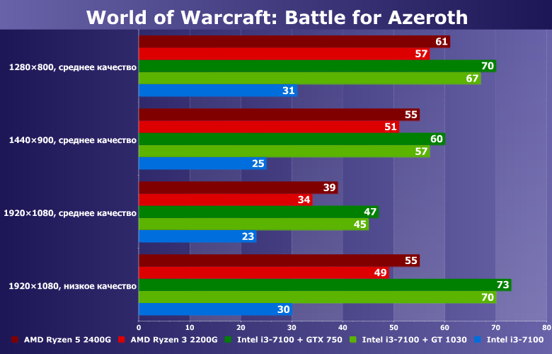 World of Warcraft: Battle for Azeroth прекрасно подходит для ПК начального уровня при игре на средних настройках качества во всех разрешениях ниже 1920×1080, да и в Full HD играть можно при тех же средних настройках, но при этом играбельность получается хорошей только у обоих тандемов Intel Core i3-7100 + GTX 750/GT 1030). На платформах AMD Ryzen лучше играть на средних настройках в 1440×900. Intel Core i3-7100 в одиночестве для этой игры условно годен лишь в разрешении 1280×800 и/или при низком качестве графики. Оценка «супер» в этой игре вполне достижима для всех конфигураций, кроме интегрированной графики Intel. Еще раз отметим, что в этой игре пары Intel Core i3-7100 + GTX 750/GT 1030 смотрятся лучше, нежели их соперники из стана AMD.