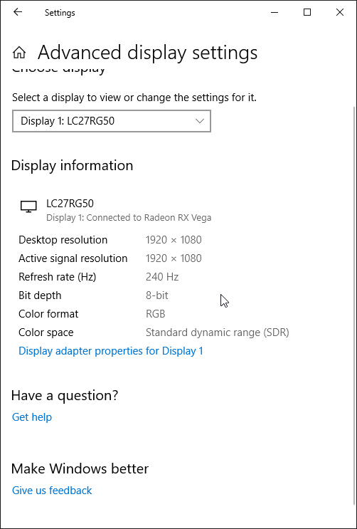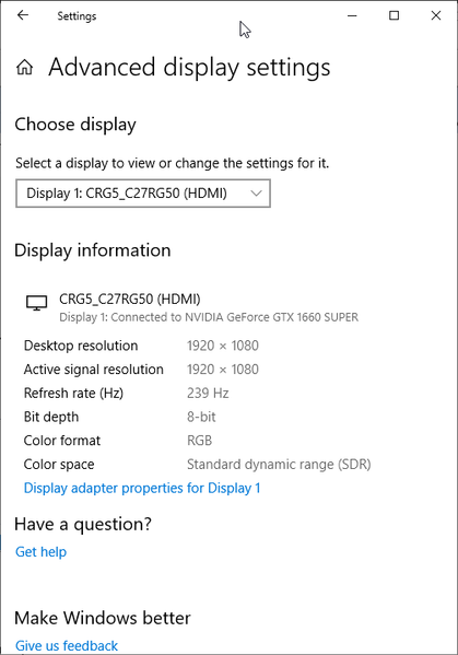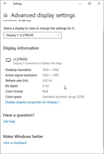 При подключении к компьютеру по DisplayPort и HDMI поддерживалось разрешение до 1920×1080 при 240 Гц кадровой частоты на вход, и вывод изображения на экран также осуществлялся с этой частотой. При таком разрешении и частоте обновления поддерживаются 8 бит на цвет (кодирование RGB).