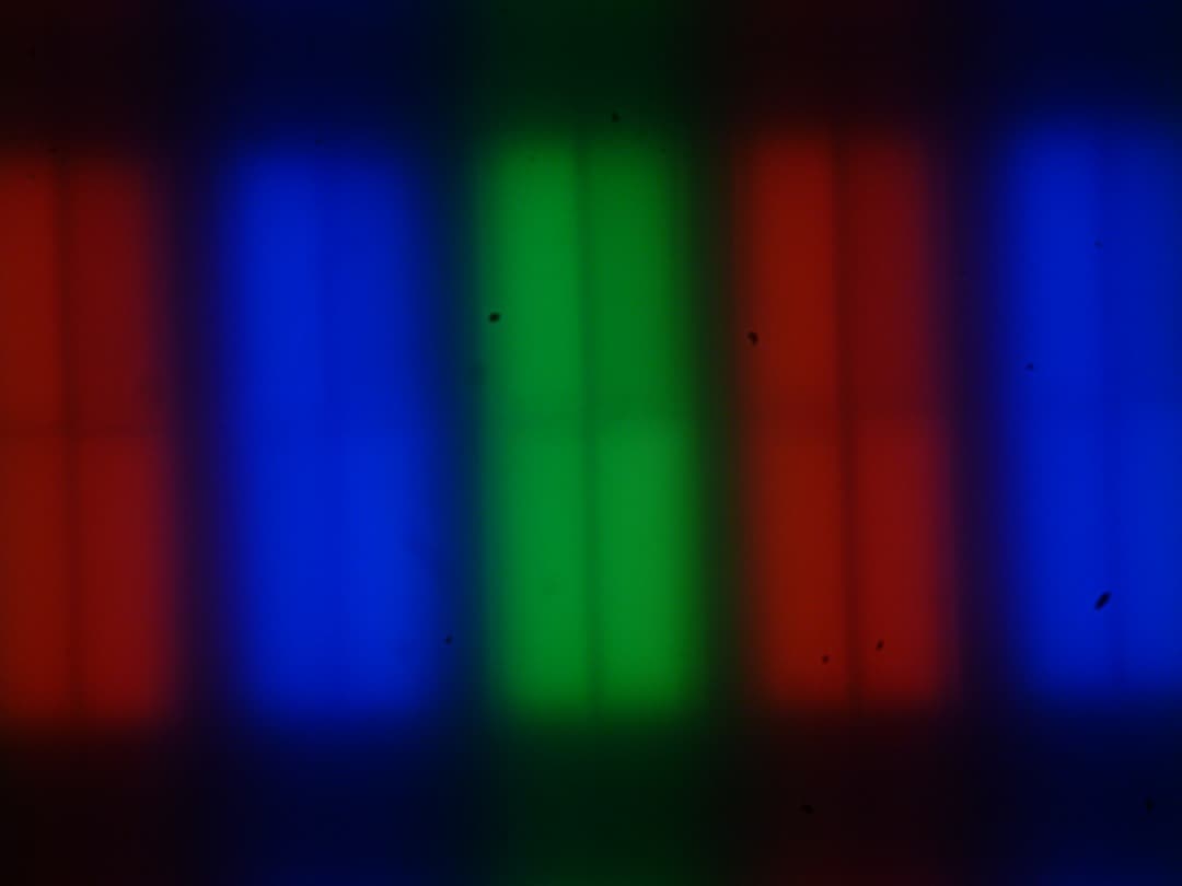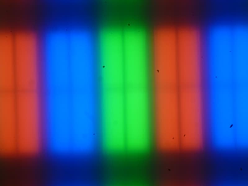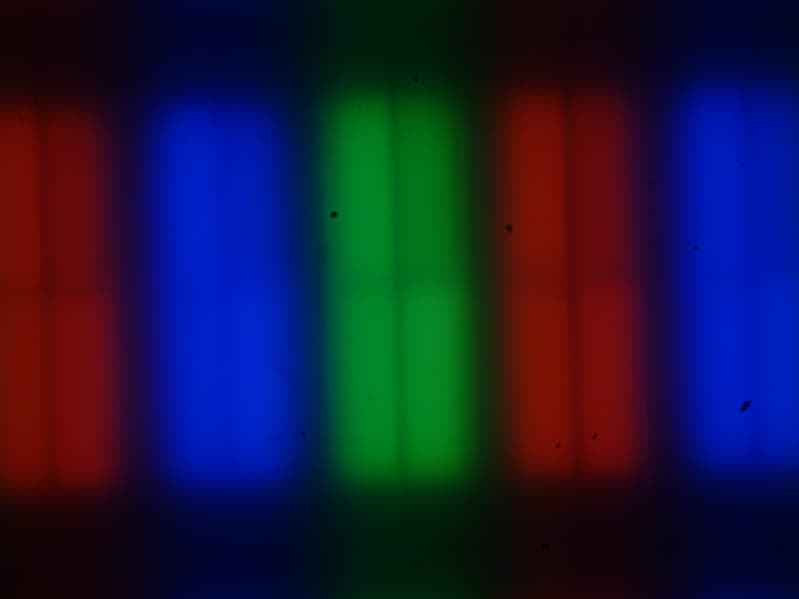 Возможно, в данном случае есть раздельное управление яркостью в доменах, так как верхняя правая четвертушка субпикселя на очень темных изображения выглядит темнее, чем оставшиеся 3/4. Фокусировка на поверхности экрана выявила хаотично расположенные микродефекты поверхности, отвечающие собственно за матовые свойства: