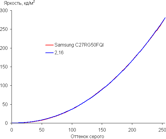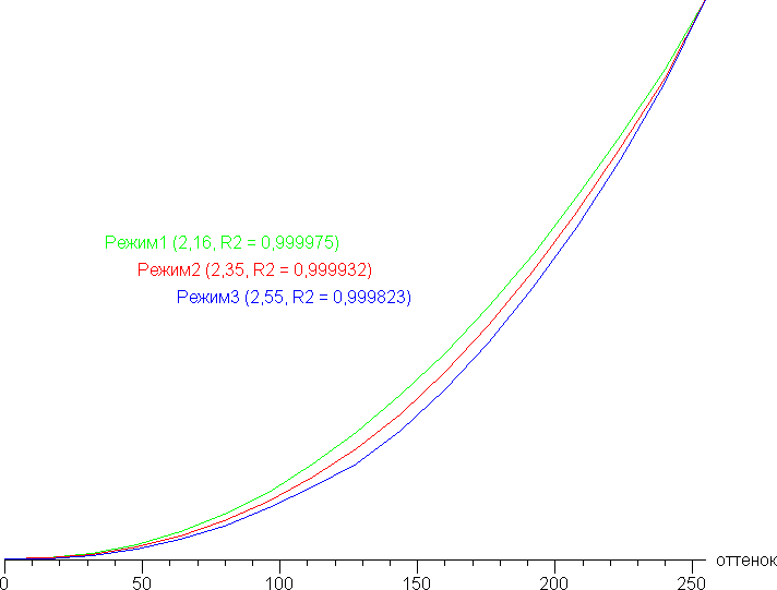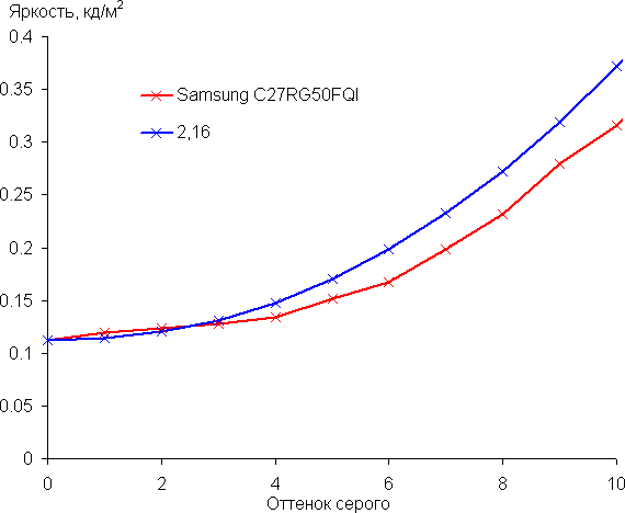 Для оценки характера роста яркости на шкале серого мы измерили яркость 17 оттенков серого при выборе различных значений в списке Гамма: