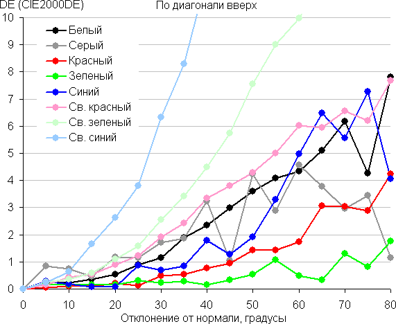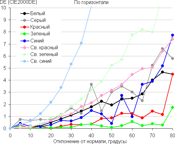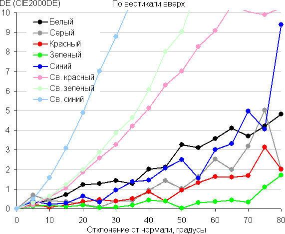 Для количественной характеристики изменения цветопередачи мы провели колориметрические измерения для белого, серого (127, 127, 127), красного, зеленого и синего, а также светло-красного, светло-зеленого и светло-синего полей во весь экран с использованием установки, подобной той, что применялась в предыдущем тесте. Измерения проводились в диапазоне углов от 0° (датчик направлен перпендикулярно к экрану) до 80° с шагом в 5°. Полученные значения интенсивностей были пересчитаны в ΔE относительно замера каждого поля при перпендикулярном положении датчика относительно экрана. Результаты представлены ниже: