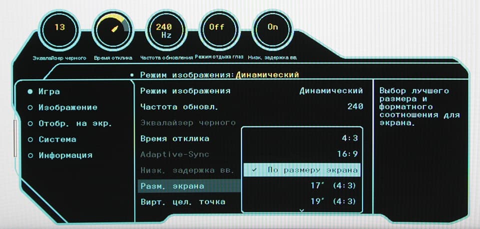 Монитор также поддерживает технологию AMD FreeSync и также только по входу DisplayPort. Для визуальной оценки мы использовали описанную в указанной статье тестовую утилиту. Включение FreeSync позволило получить изображение с плавным движением в кадре и без разрывов. Диапазон поддерживаемых частот, который указывается на панели настроек видеокарты, равен 48—240 Гц для режимов с кадровой частотой 240 Гц.