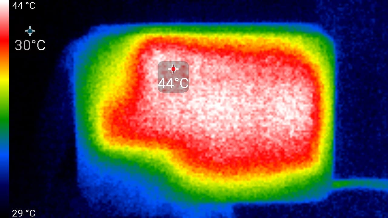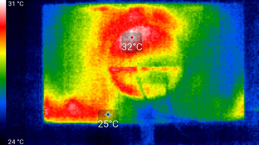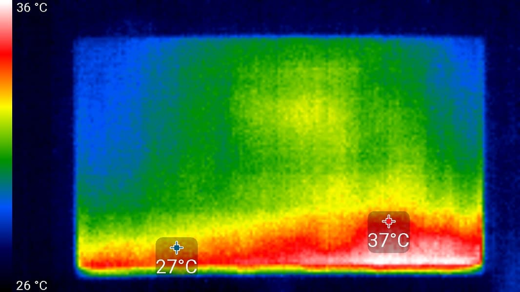 Нижний край экрана нагрелся до 37 °C максимум. Видимо, внизу находится светодиодная линейка подсветки экрана. Нагрев сзади незначительный: