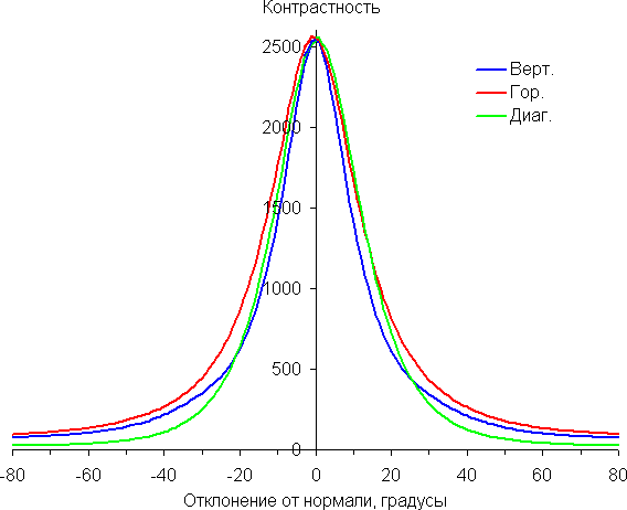 Отметим примерно одинаковый характер уменьшения яркости при отклонении от перпендикуляра к экрану во всех трех направлениях, при этом графики не пересекаются в очень широком диапазоне измеряемых углов. При отклонении в диагональном направлении яркость черного поля растет немного быстрее, чем в двух других случаях. Однако максимум яркости черного поля все равно меньше, чем в случае типичного монитора на матрице IPS. Контрастность в диапазоне углов ±82° приближается к отметке 10:1 только при отклонении по диагонали, но все равно эту границу не пересекает.