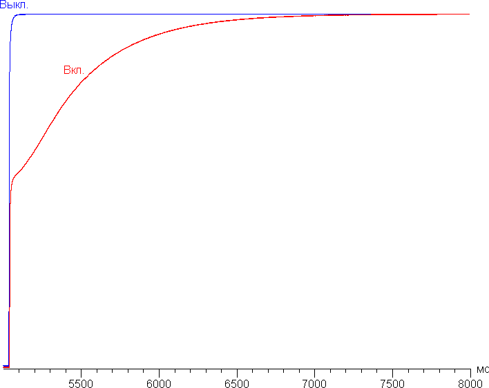При включении режима Интел. экосохр.+ при выводе черного поля на весь экран яркость подсветки начинает медленно снижаться, но совсем она не выключается. При переключении на вывод белого поля яркость немного быстрее возрастает до установленного пользователем максимума. График ниже показывает, как увеличивается яркость (вертикальная ось) при переключении с черного поля (после пяти секунд вывода) на белое при выключенной и включенной динамической подстройке яркости: