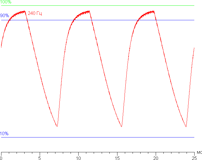 Видно, что при 240 Гц чередования максимальная яркость белого кадра превышает уровень 90% от белого, минимальная яркость черного кадра выше 10% от белого, но амплитуда изменения яркости все равно достаточно большая (почти 80% от яркости белого). То есть скорости матрицы практически достаточно для полноценного вывода изображения с кадровой частотой 240 Гц.