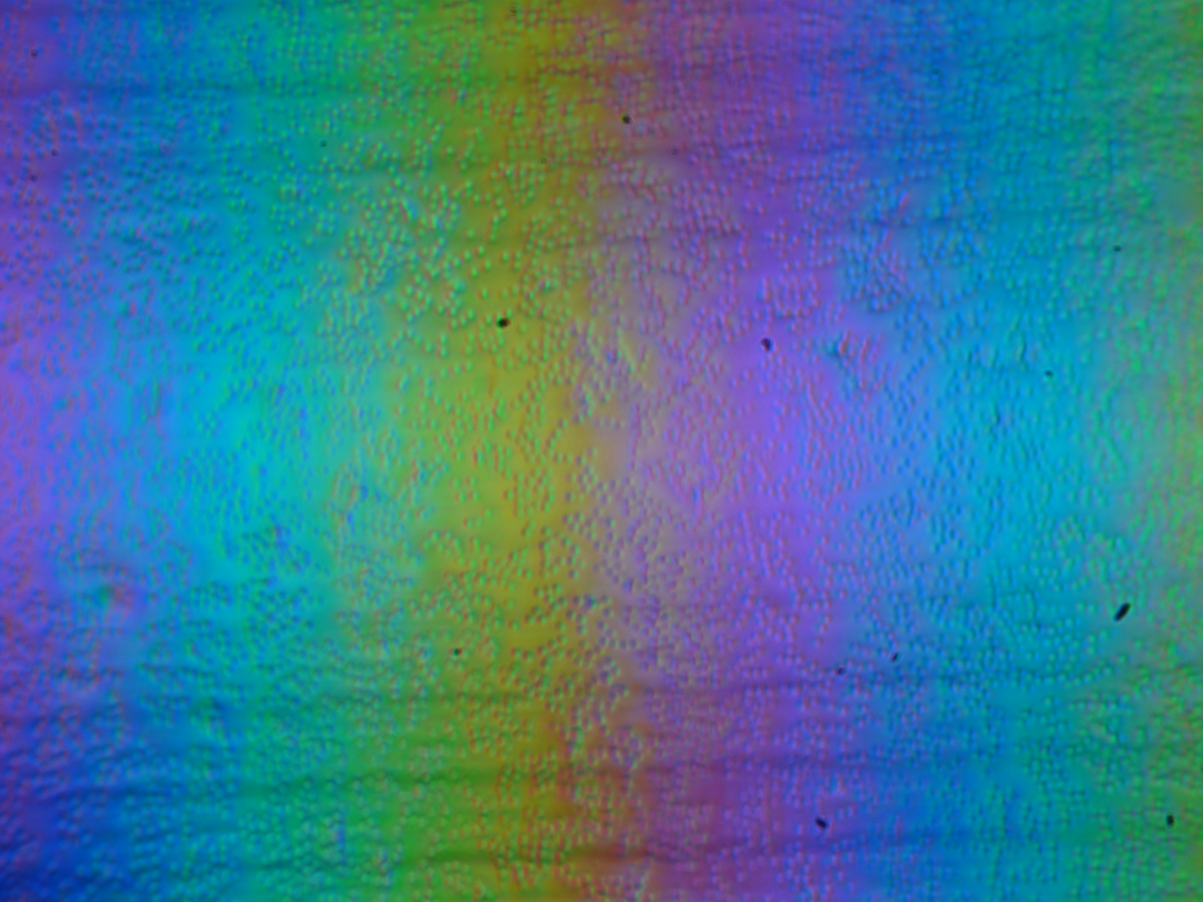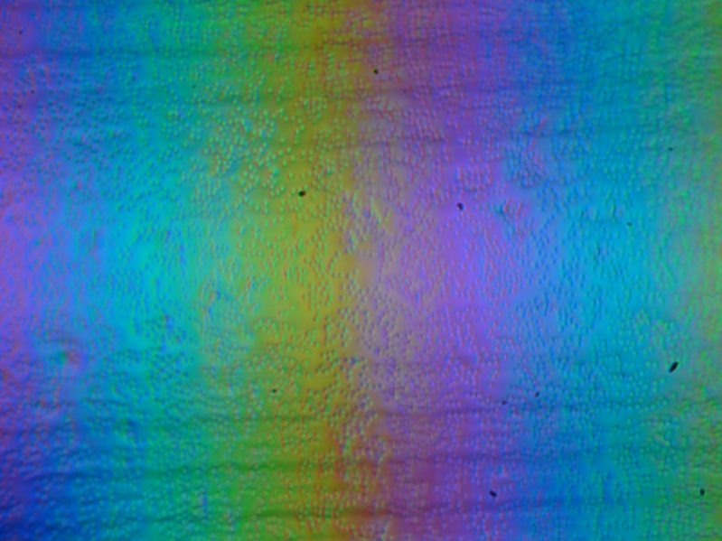 Зерно этих дефектов в несколько раз меньше размеров субпикселей (масштаб этих трех фотографий одинаковый), поэтому фокусировка на микродефектах и «перескок» фокуса по субпикселям при изменении угла зрения выражены слабо, из-за этого нет и «кристаллического» эффекта.