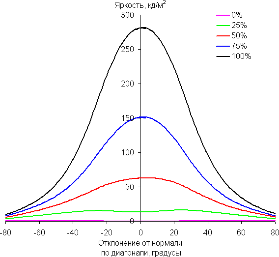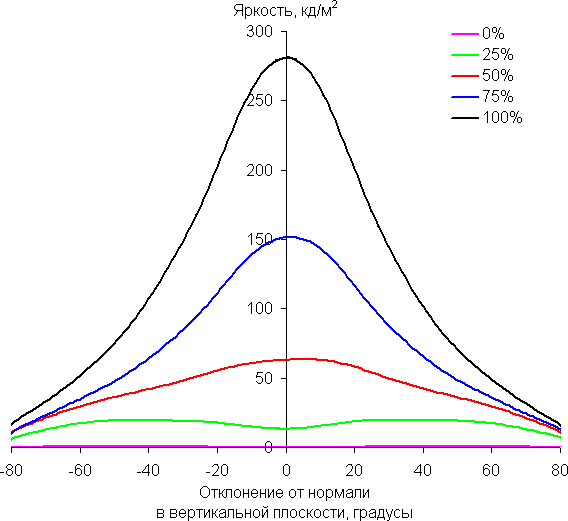 Из графиков следует, что при взгляде под углом хотя бы основные цвета меняются несильно, но полутона (особенно светло-синий) существенно изменяются, что ожидаемо для матрицы типа *VA и является ее основным недостатком.