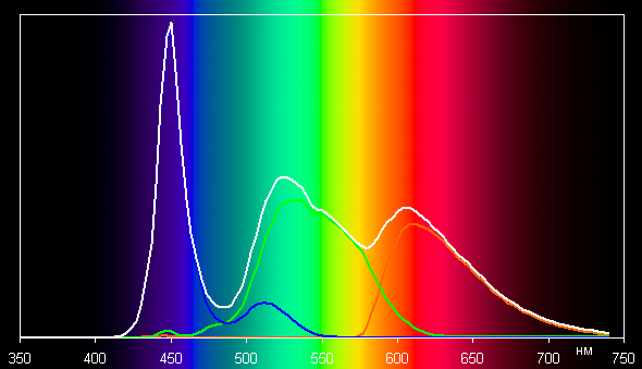 Такой спектр с относительно узким пиком синего и с широкими горбами зеленого и красного цветов характерен для мониторов, в которых используется белая светодиодная подсветка с синим излучателем и желтым люминофором.